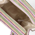 L'interno, anch'esso in paglia intrecciata, aggiunge un tocco di originalità e leggerezza. La chiusura con zip garantisce sicurezza e praticità, proteggendo i tuoi effetti personali.