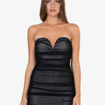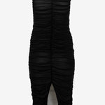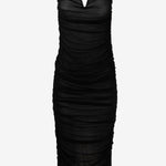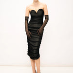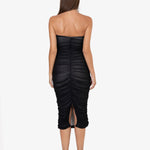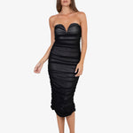 L'abito presenta un design senza spalline con un taglio a cuore che valorizza il décolleté. La texture drappeggiata, creata da un sapiente gioco di pieghe, dona movimento e un tocco di eleganza senza tempo. La lunghezza midi lo rende versatile, perfetto sia per occasioni speciali che per serate più informali.