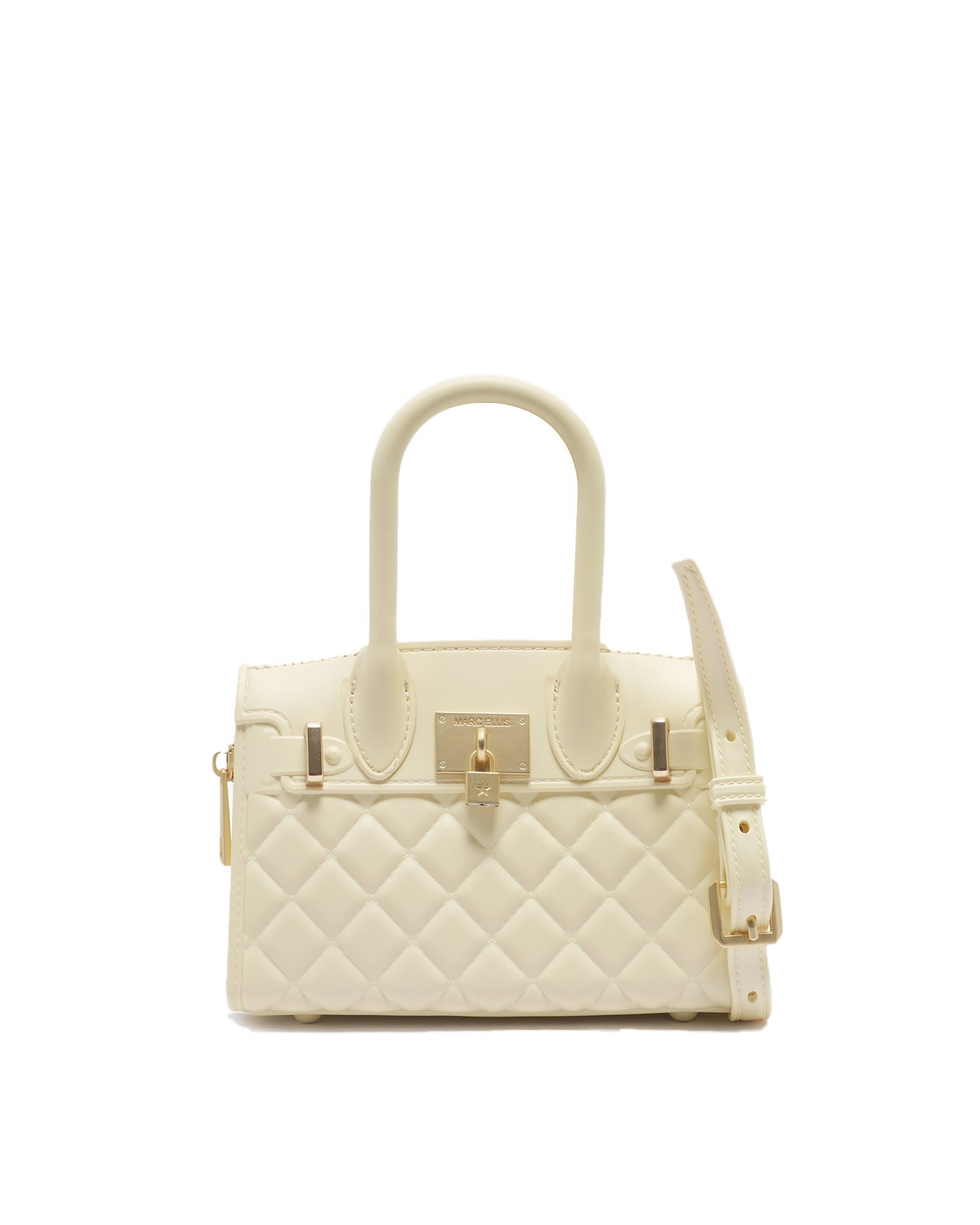 Borsa a mano da donna. La chiusura è con zip. Le tasche interne sono assenti. Le tasche esterne sono assenti. La tracolla è gomma. Il manico è gomma. Gli scomparti interni sono uno. Il materiale esterno è PVC.