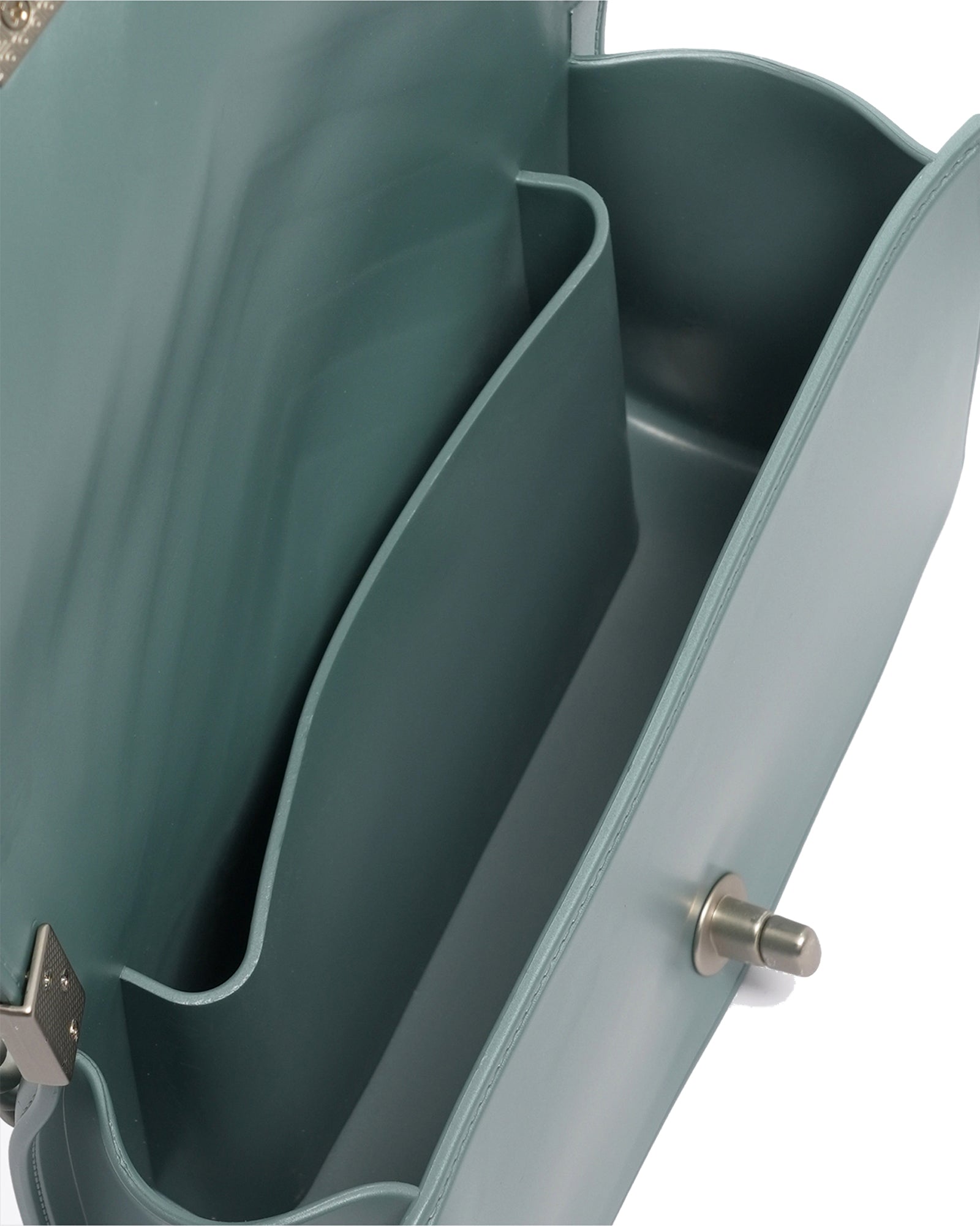 Borsa a mano da donna. La chiusura è con girello. Le tasche interne sono una aperta. Le tasche esterne sono assenti. La tracolla è regolabile e rimovibile in tessuto. Il manico è catena. Gli scomparti interni sono uno.
