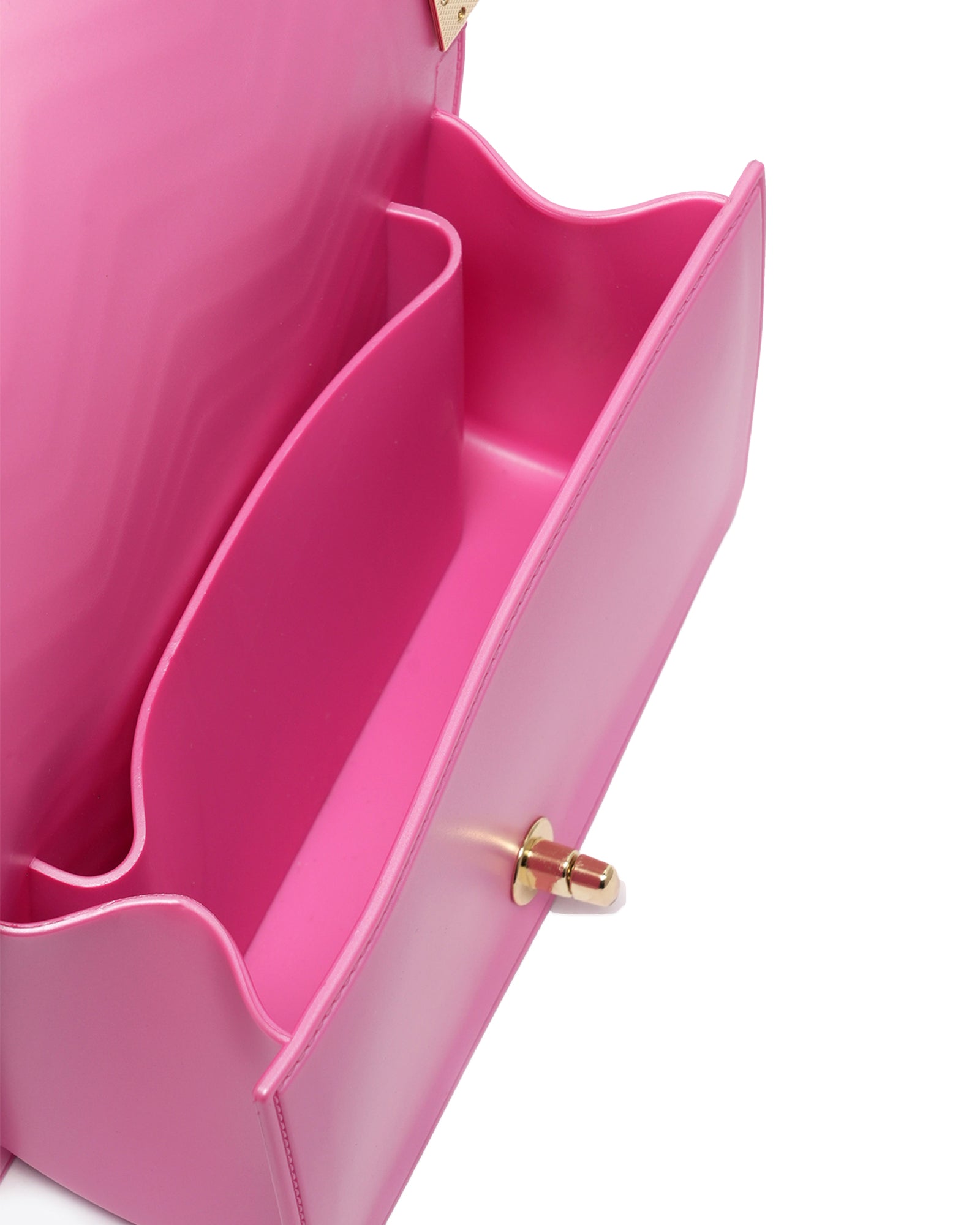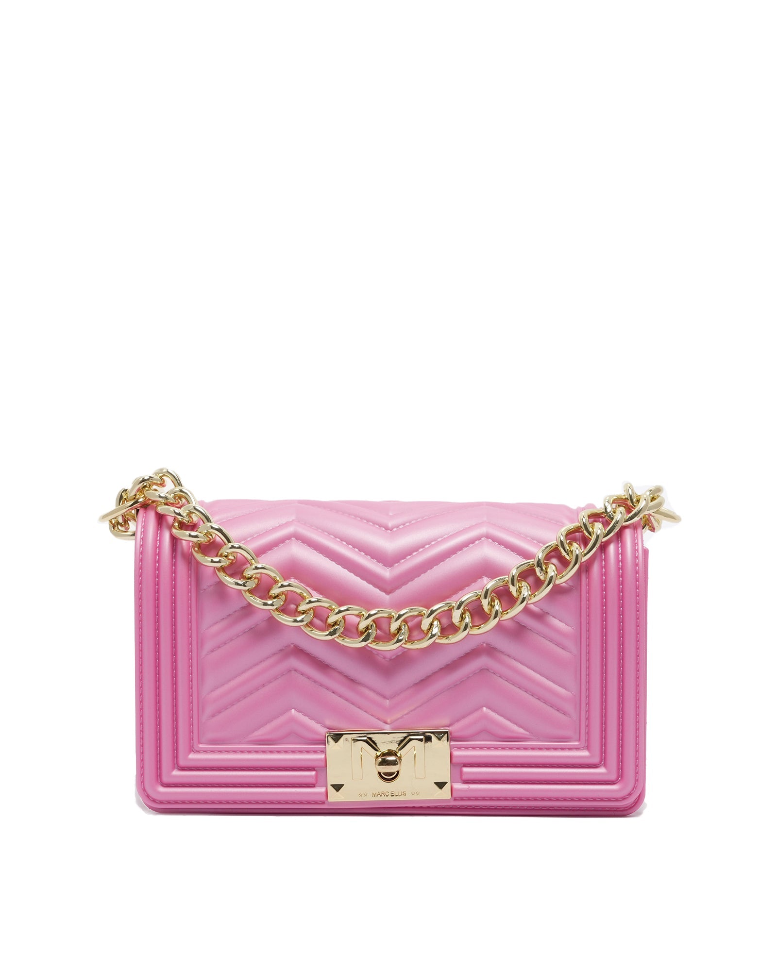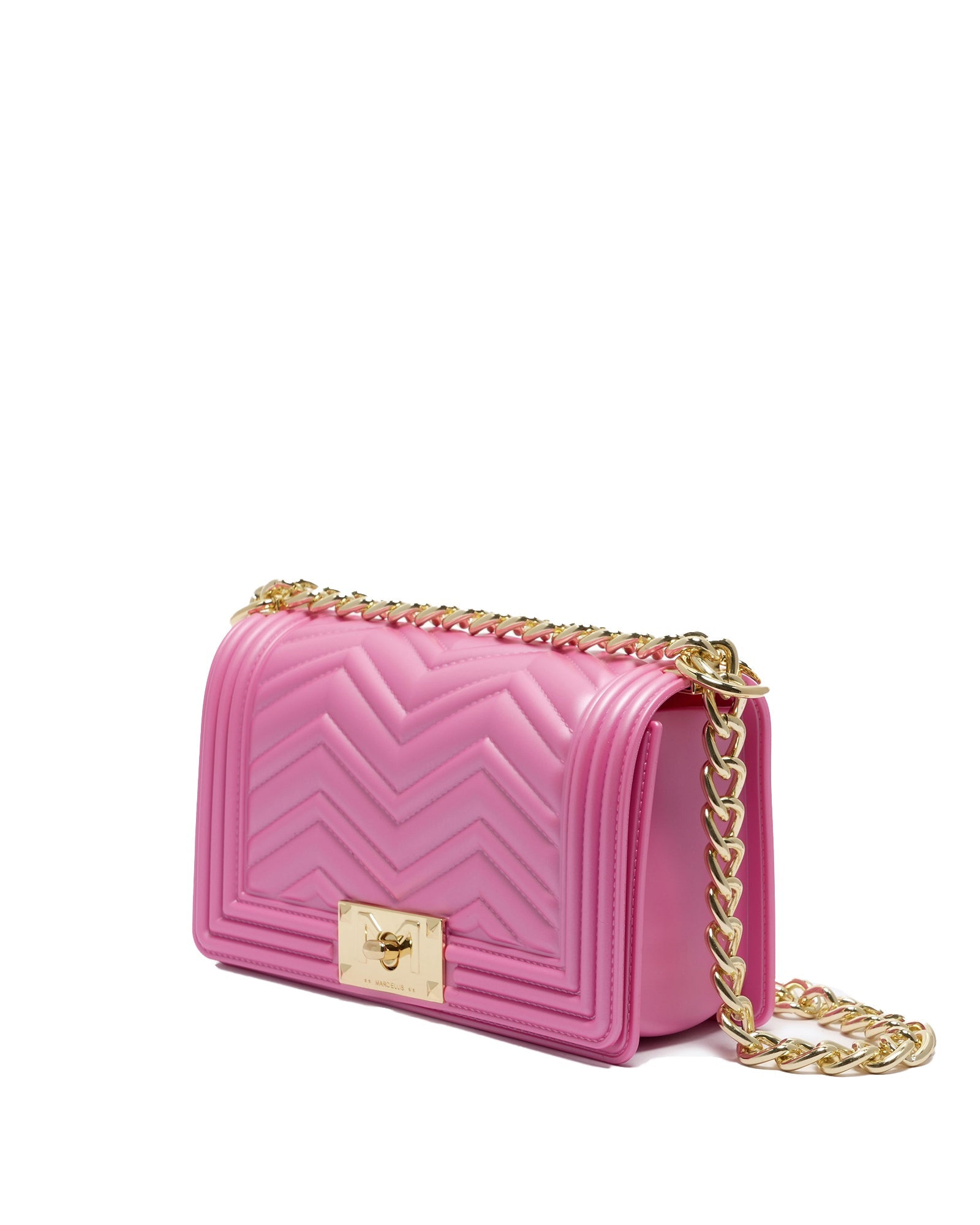 Borsa a mano da donna. La chiusura è con girello. Le tasche interne sono assenti. Le tasche esterne sono assenti. La tracolla è catena. Il manico è assente. Gli scomparti interni sono uno. Il materiale esterno è PVC.