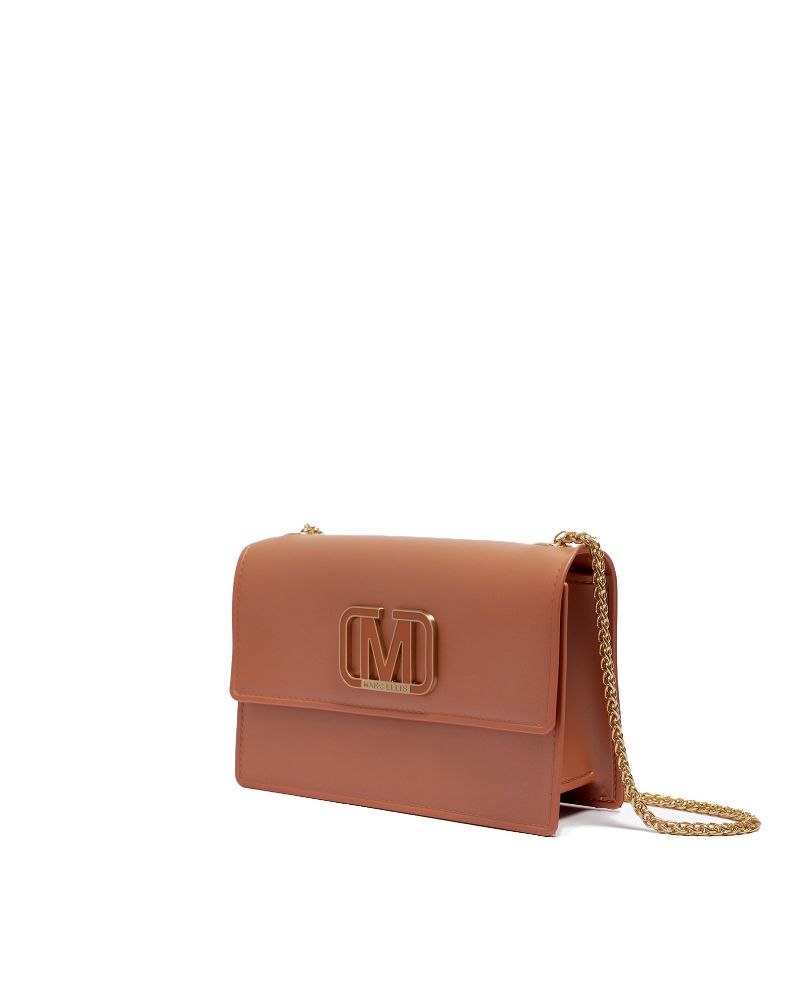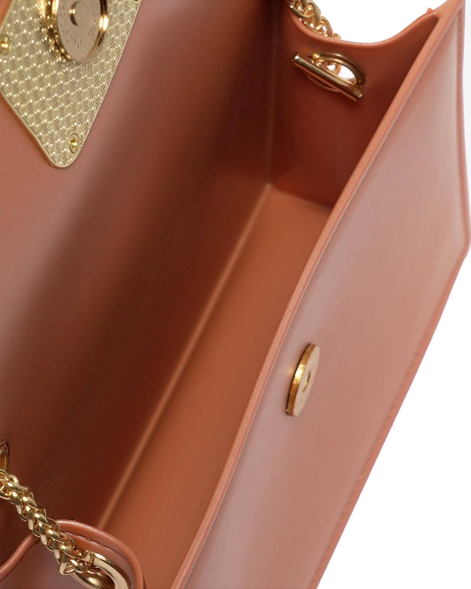 Borsa a mano da donna. La chiusura è con bottone magnetico. Le tasche interne sono assenti. Le tasche esterne sono assenti. La tracolla è catena. Il manico è assente. Gli scomparti interni sono uno. Il materiale esterno è PVC.