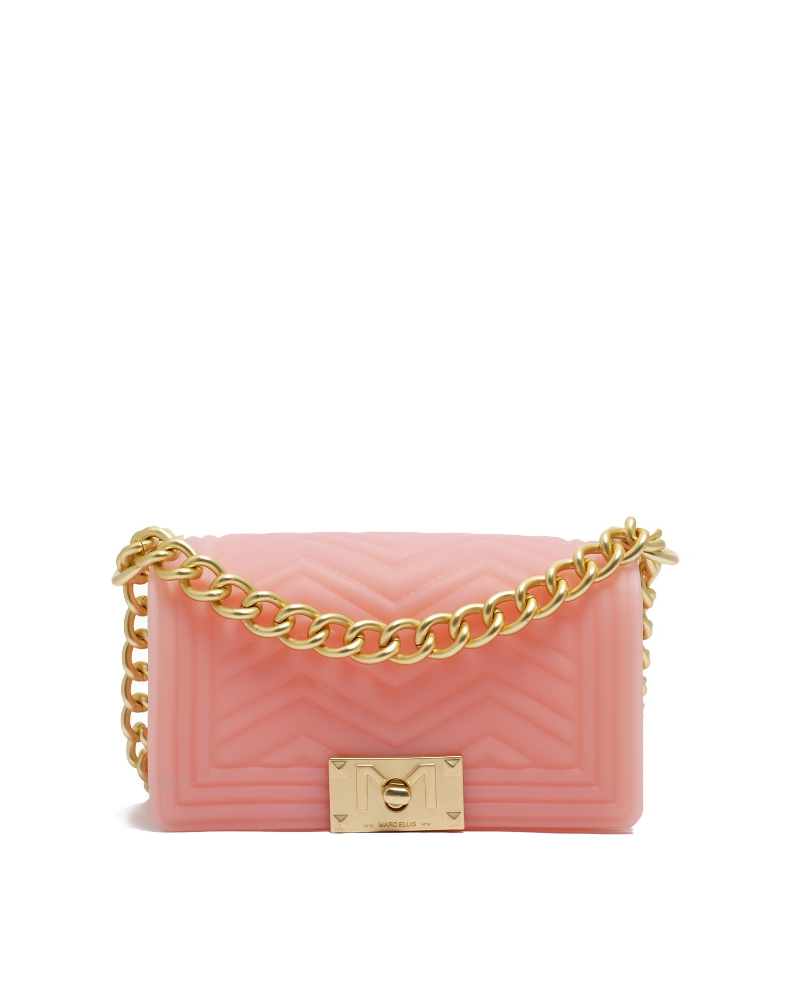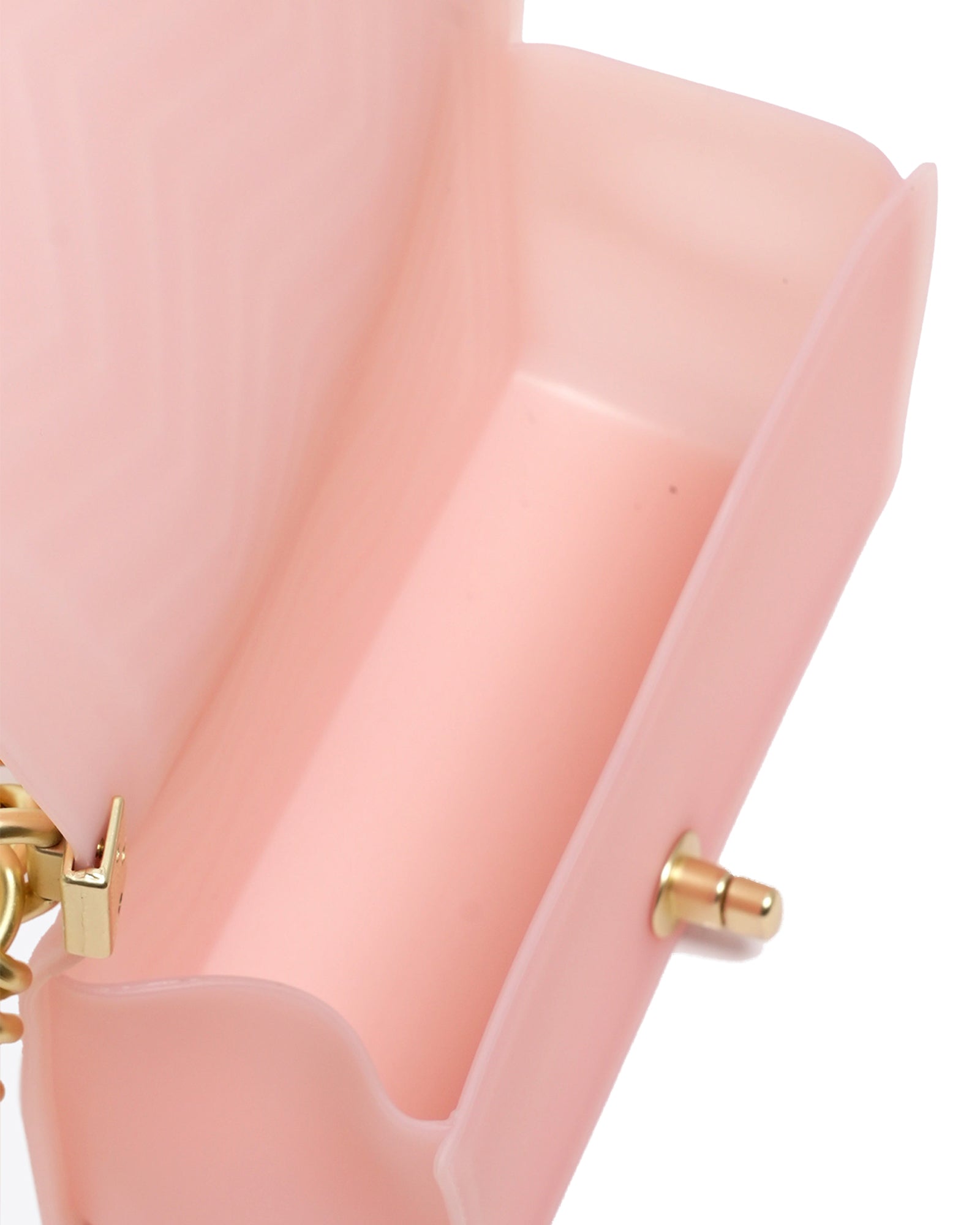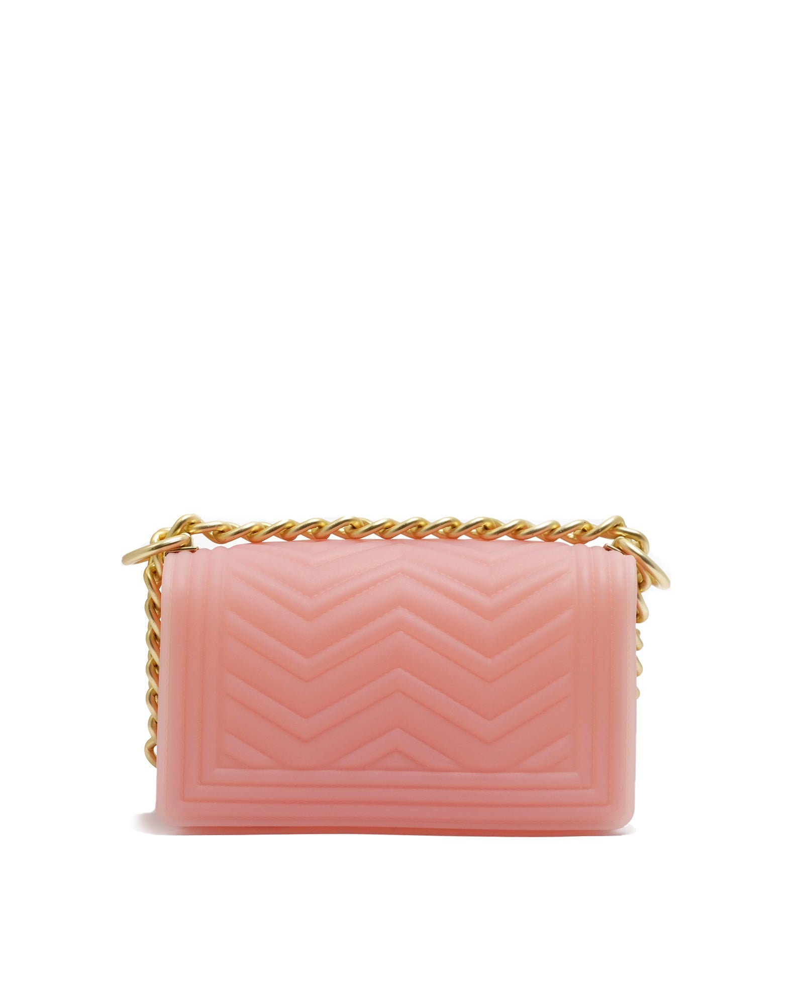 Borsa a mano da donna. La chiusura è con girello. Le tasche interne sono assenti. Le tasche esterne sono assenti. La tracolla è catena. Il manico è assente. Gli scomparti interni sono uno. Il materiale esterno è PVC.
