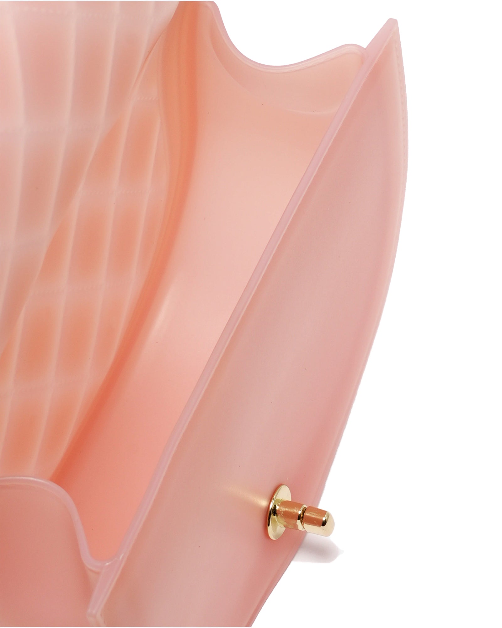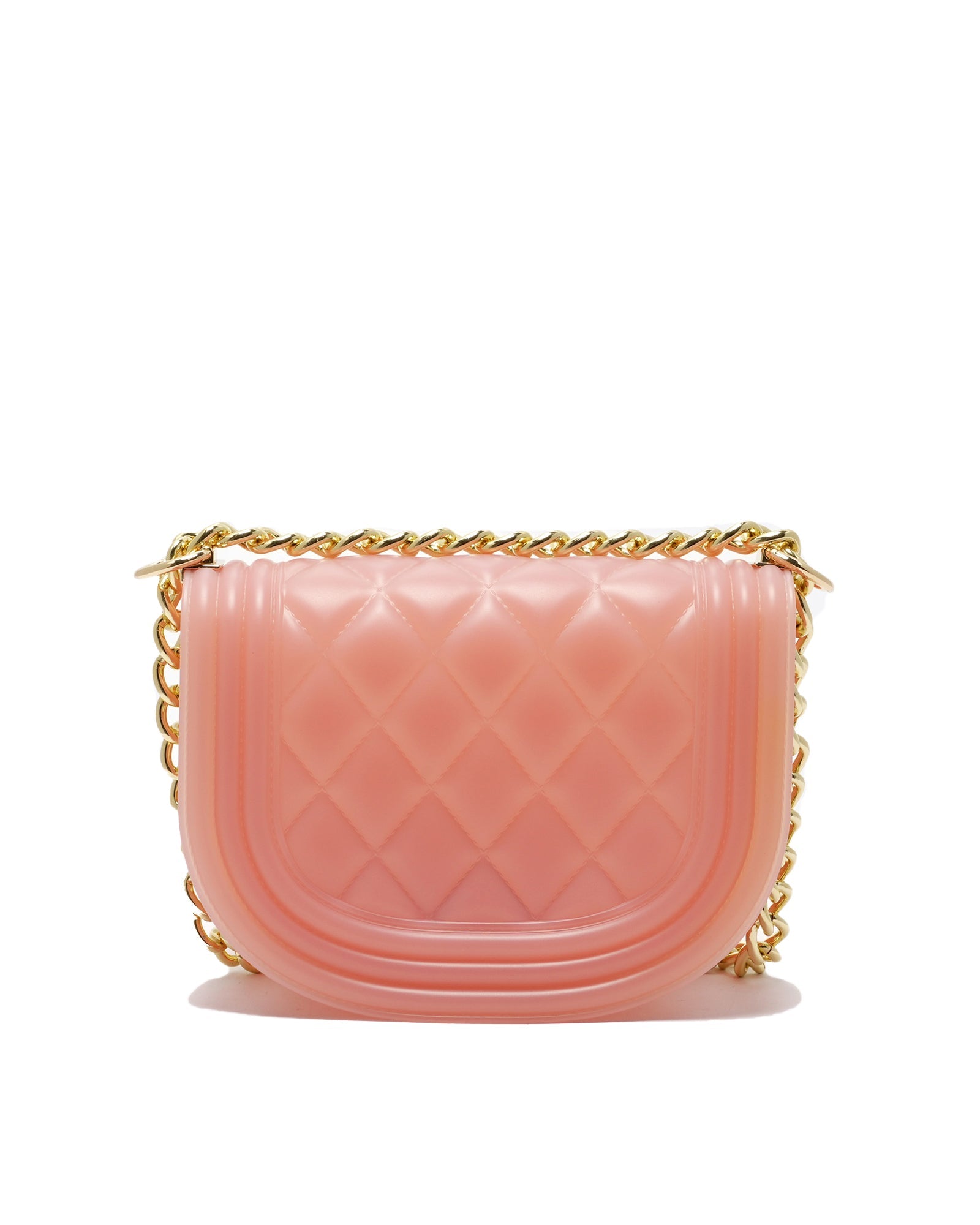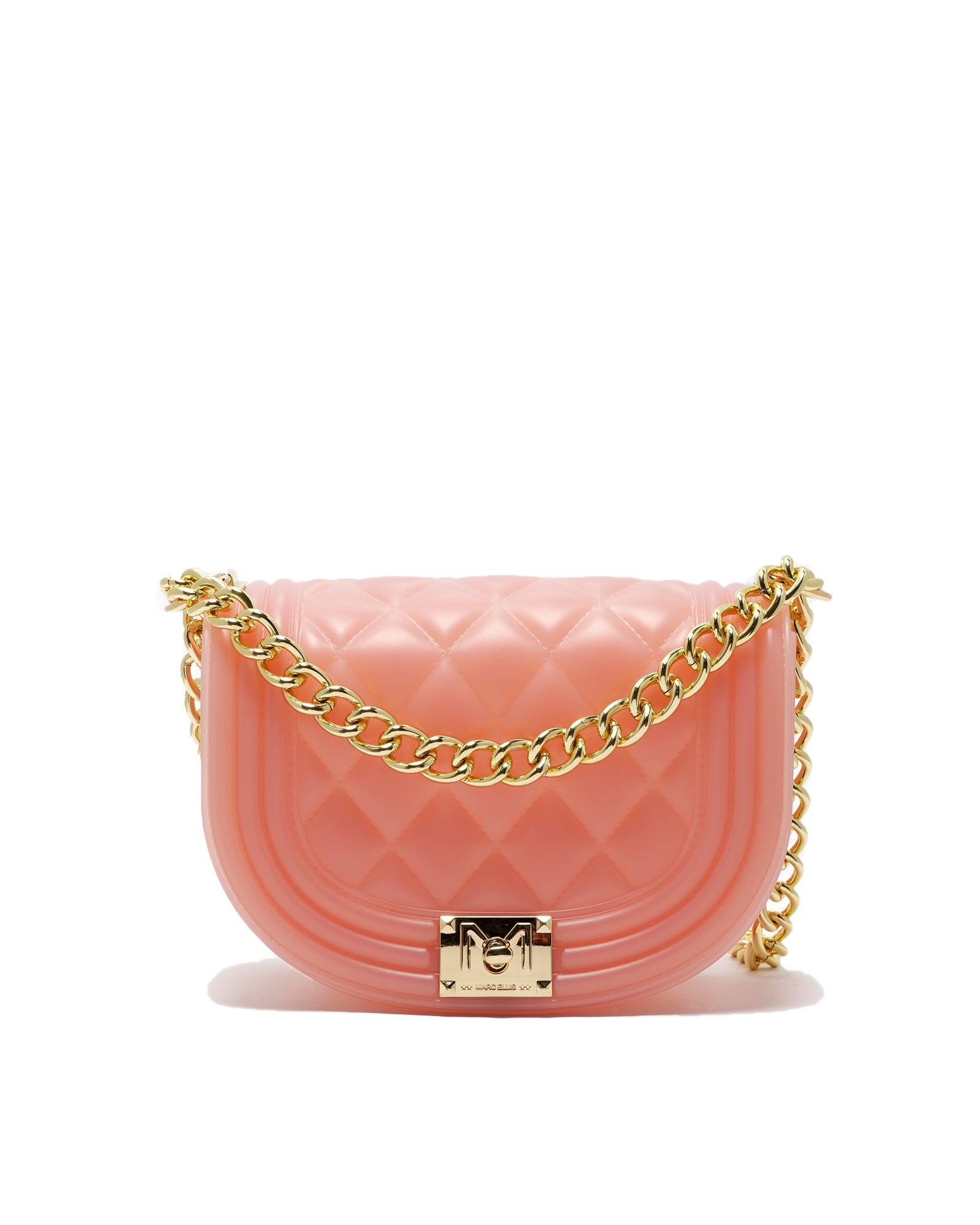 Borsa a mano da donna. La chiusura è con girello. Le tasche interne sono assenti. Le tasche esterne sono assenti. La tracolla è catena. Il manico è assente. Gli scomparti interni sono uno. Il materiale esterno è PVC.