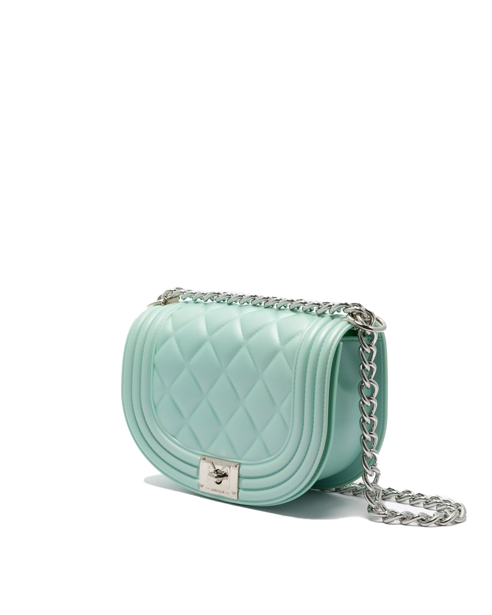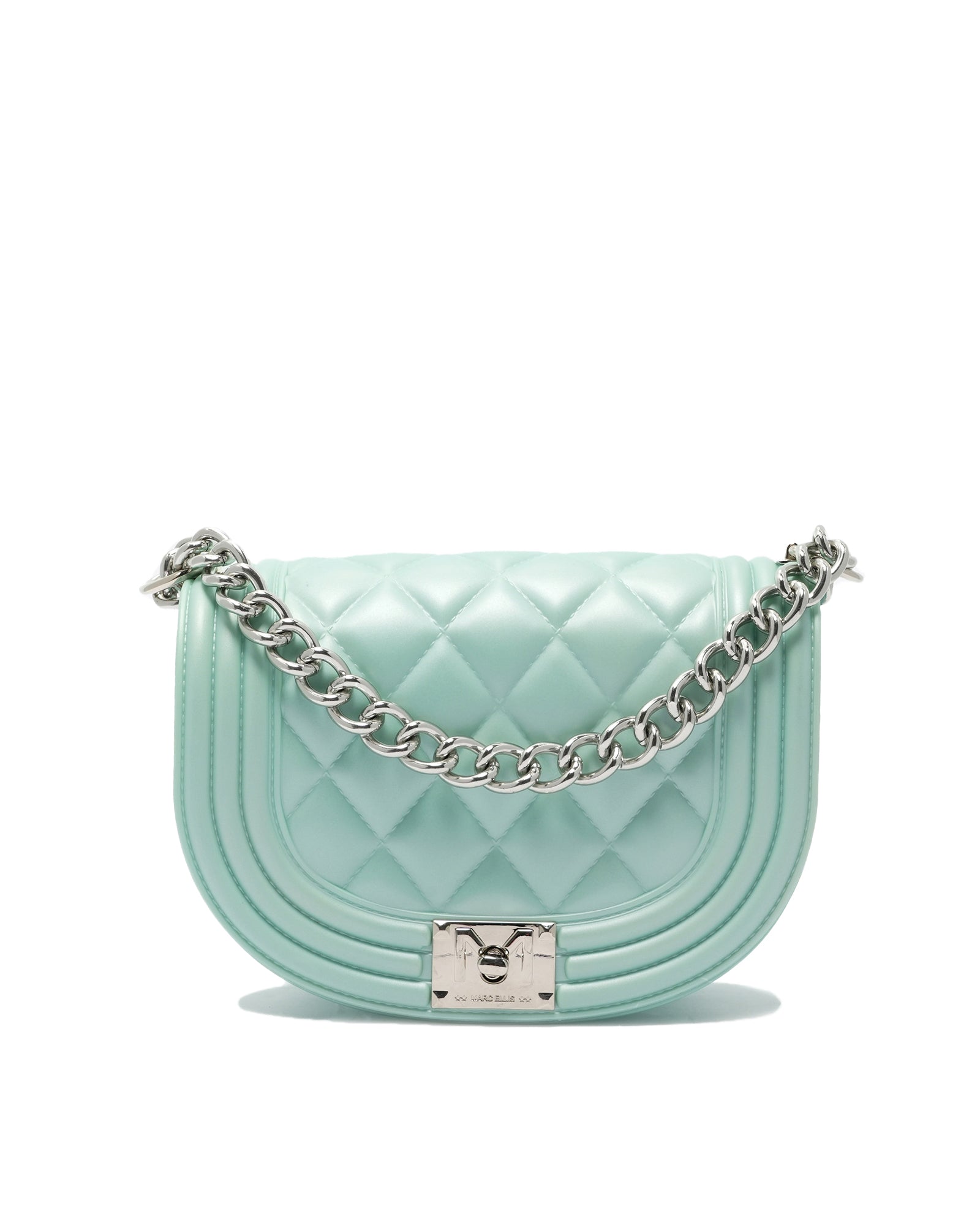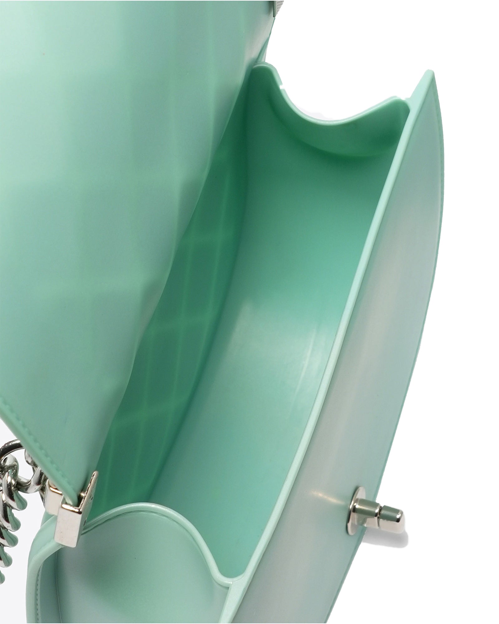 Borsa a mano da donna. La chiusura è con girello. Le tasche interne sono assenti. Le tasche esterne sono assenti. La tracolla è catena. Il manico è assente. Gli scomparti interni sono uno. Il materiale esterno è PVC.