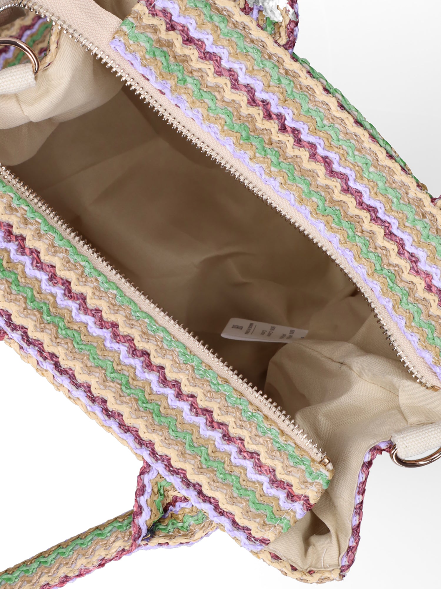 L'interno, anch'esso in paglia intrecciata, aggiunge un tocco di originalità e leggerezza. La chiusura con zip garantisce sicurezza e praticità, proteggendo i tuoi effetti personali.