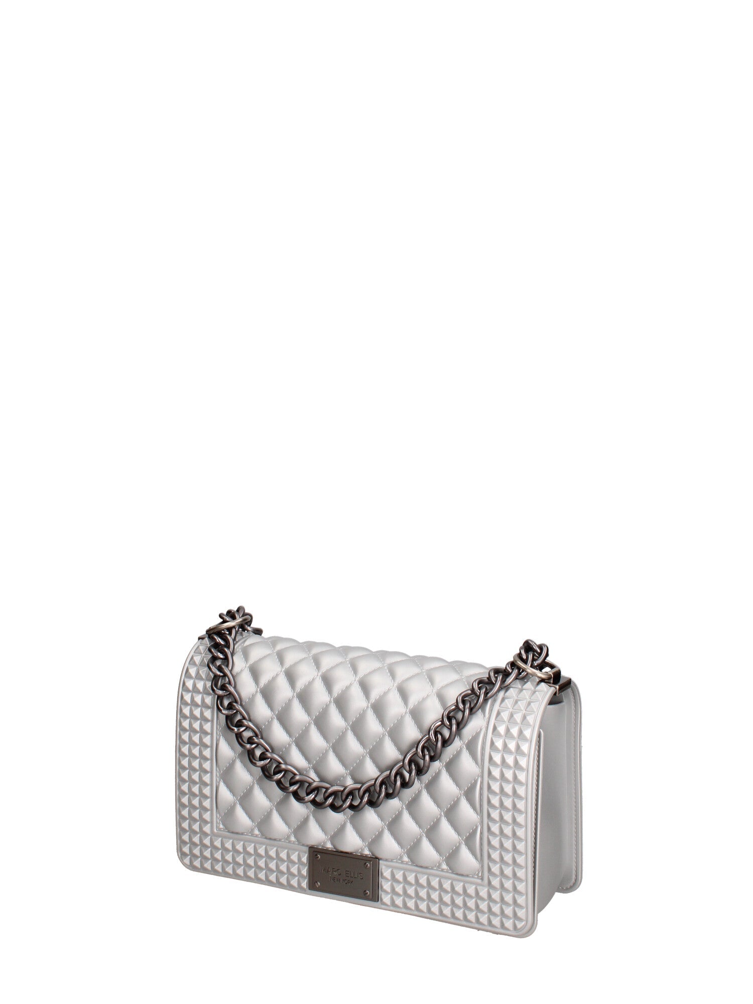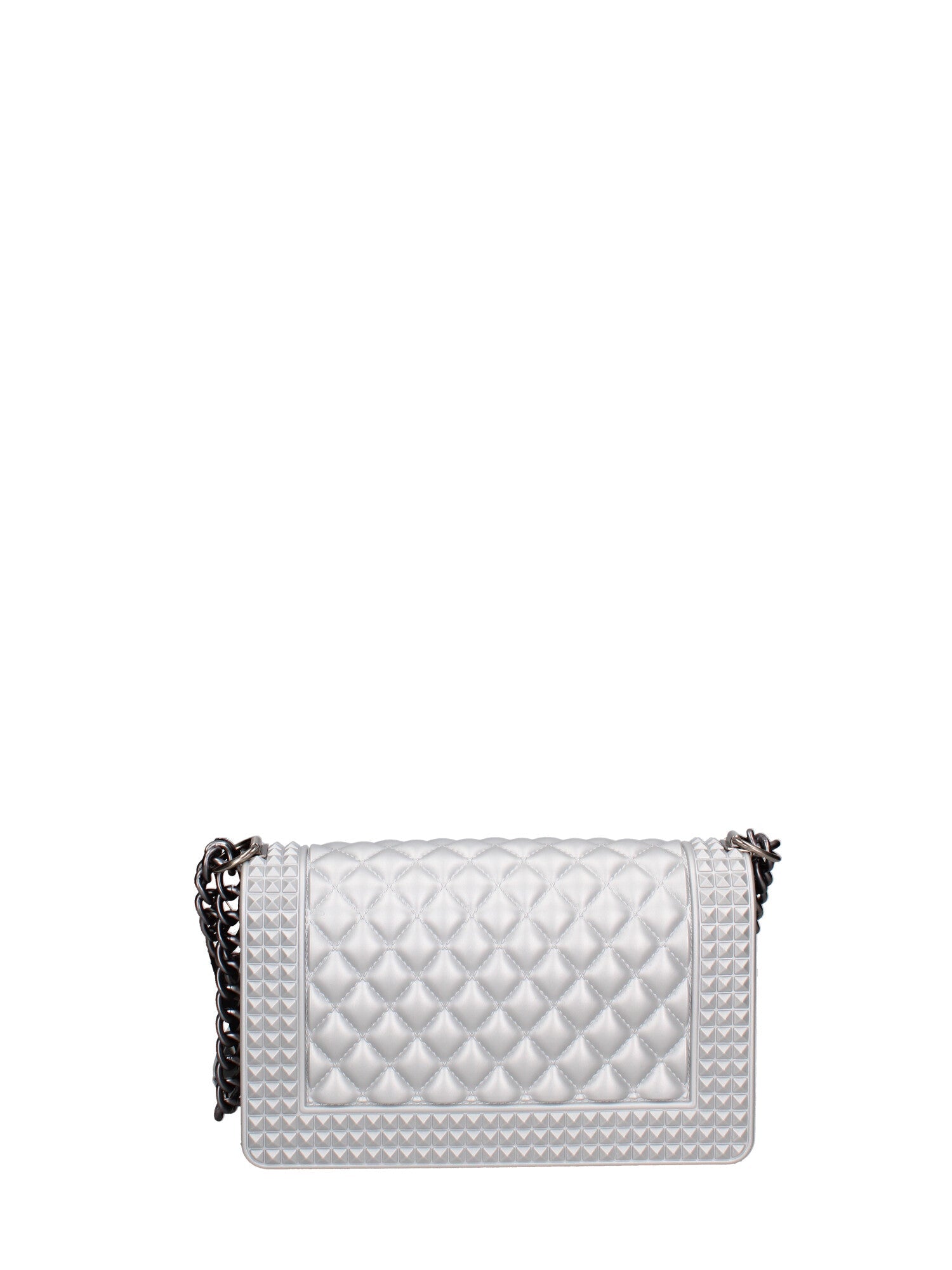 Borsa a mano da donna. La chiusura è con girello. Le tasche interne sono assenti. Le tasche esterne sono assenti. La tracolla è regolabile e rimovibile. Il manico è catena. Gli scomparti interni sono uno. Il materiale esterno è 100% Gomma. Internamente è 100 % Gomma. Misure: 15x25x8 cm . Prodotto Fashion