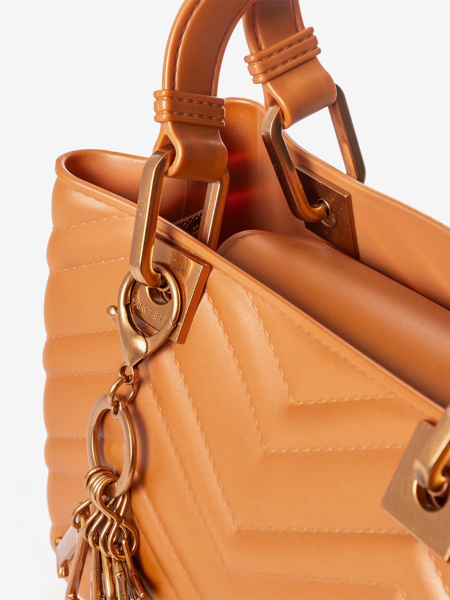 Realizzata interamente in gomma di alta qualità, sia all'interno che all'esterno, questa borsa offre una texture unica e una resistenza sorprendente. La sua elegante silhouette è arricchita da una lavorazione trapuntata che aggiunge profondità e raffinatezza.