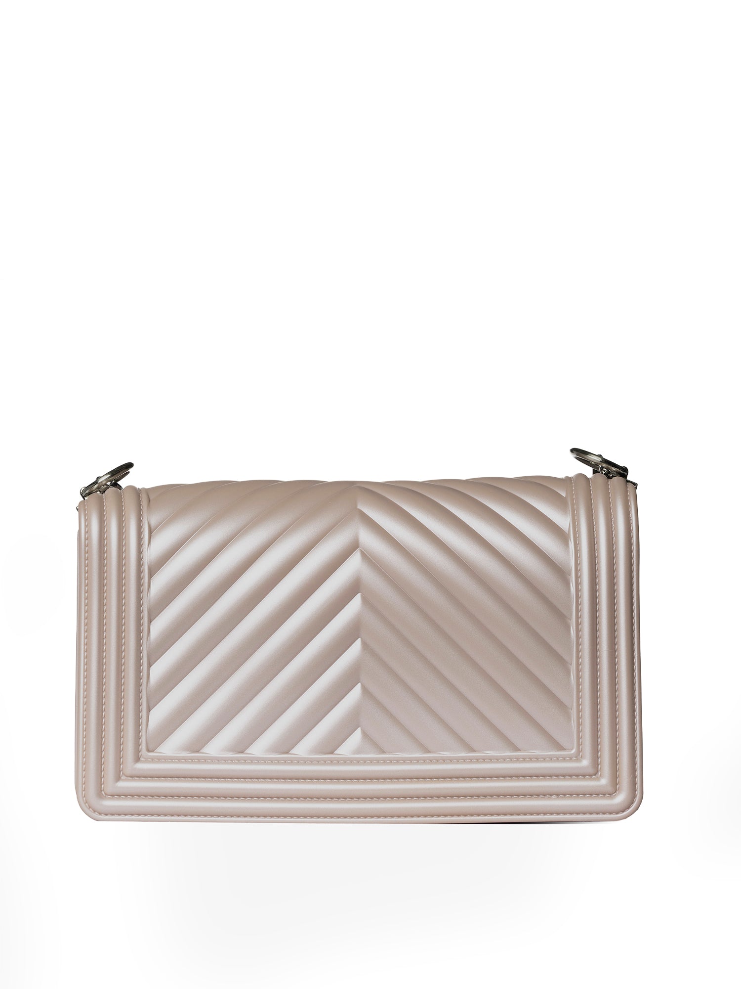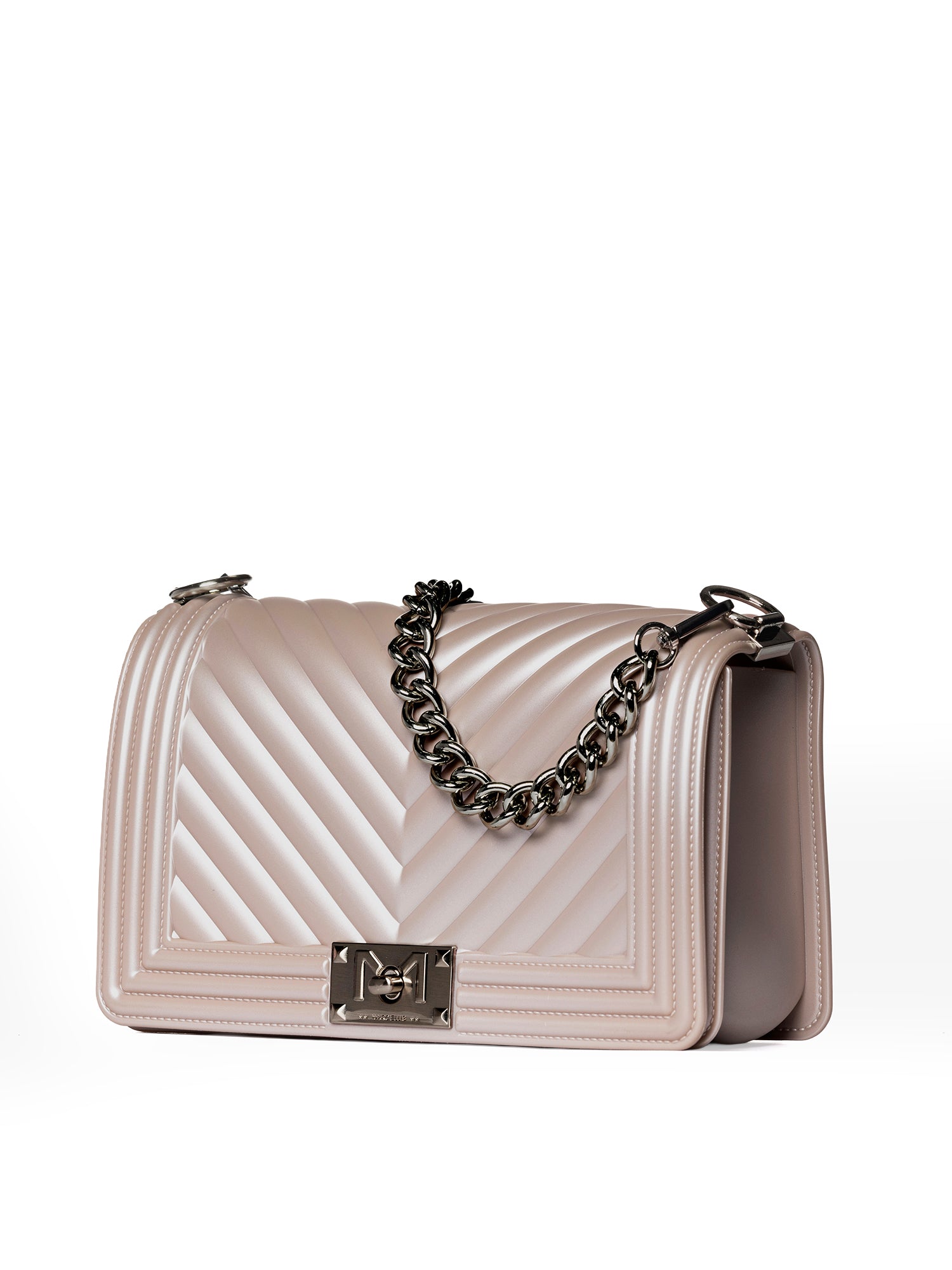 Realizzata interamente in gomma di alta qualità, sia all'interno che all'esterno, questa borsa offre una texture unica e una resistenza sorprendente. Il design elegante è arricchito da una chiusura a girello che aggiunge un tocco di raffinatezza.