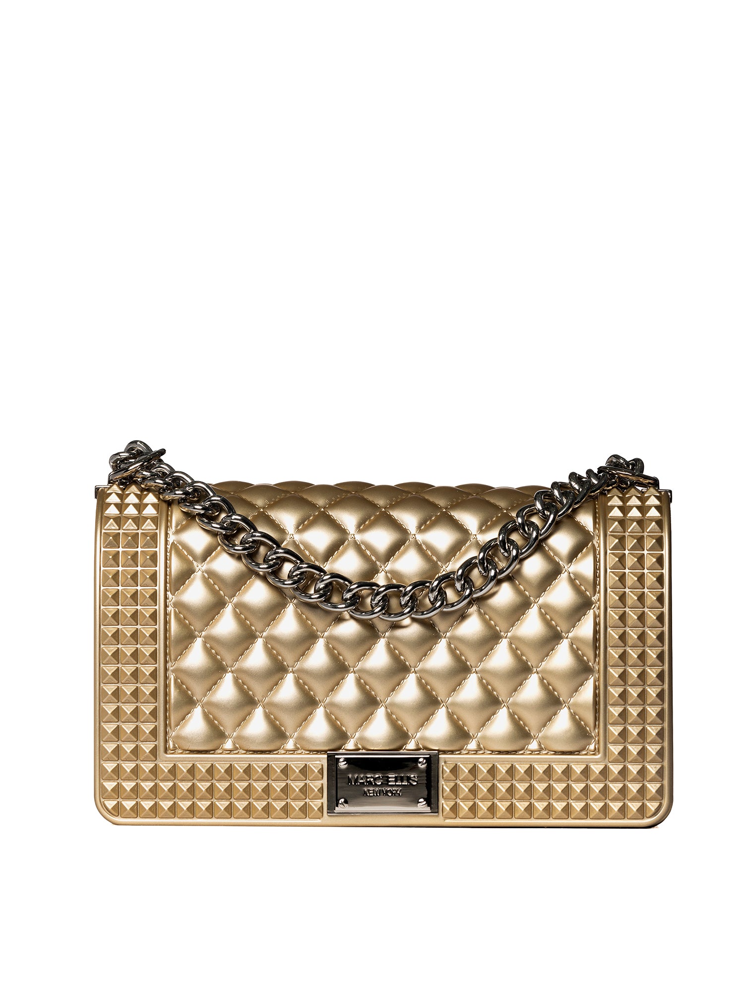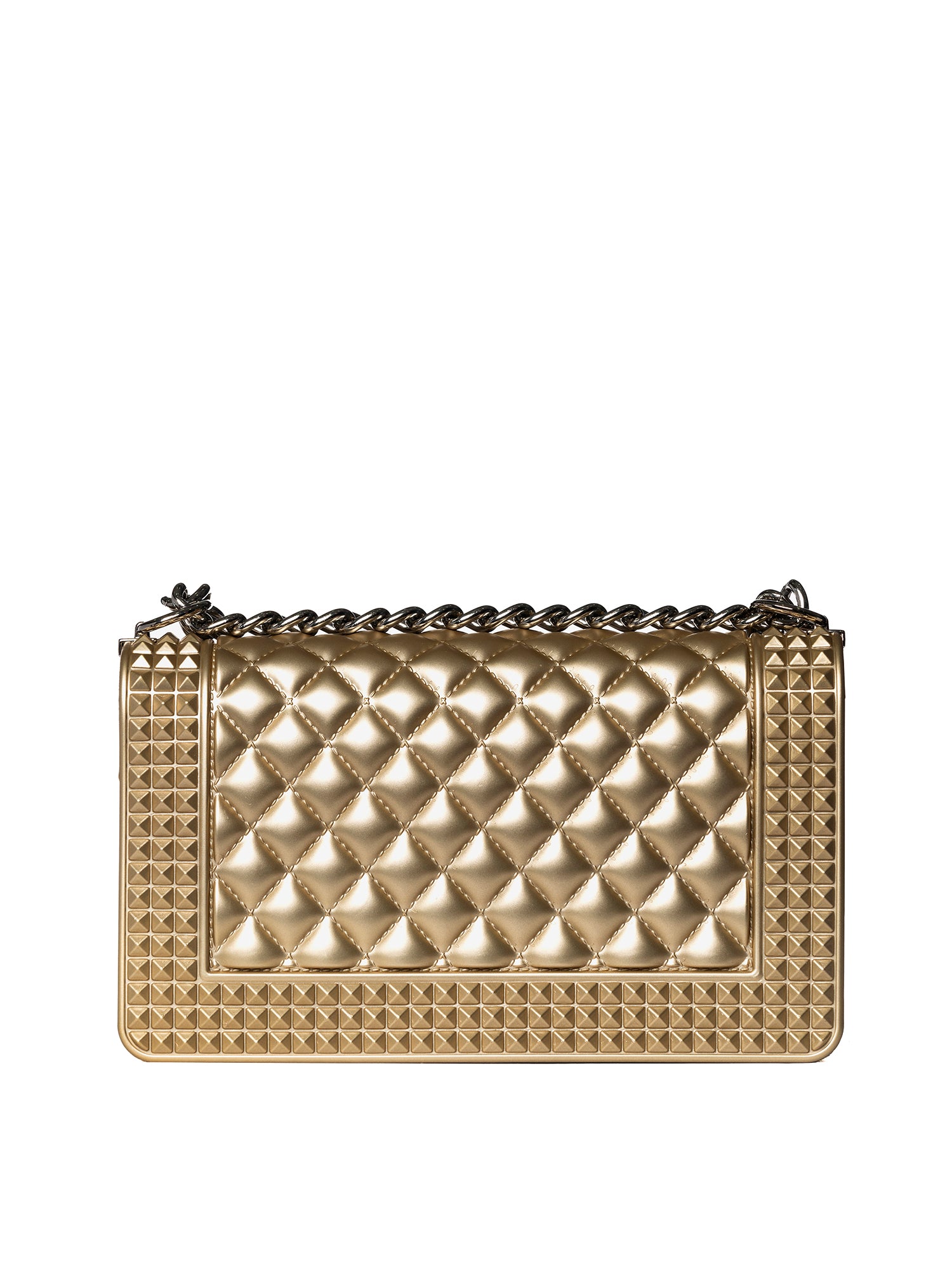 Realizzata interamente in gomma di alta qualità, questa borsa si distingue per la sua texture matelassé, un dettaglio iconico che aggiunge un tocco di lusso ad ogni outfit. La sua forma compatta e strutturata è valorizzata da una raffinata tracolla a catena, che consente di portarla comodamente a spalla o di trasformarla in una pochette elegante.