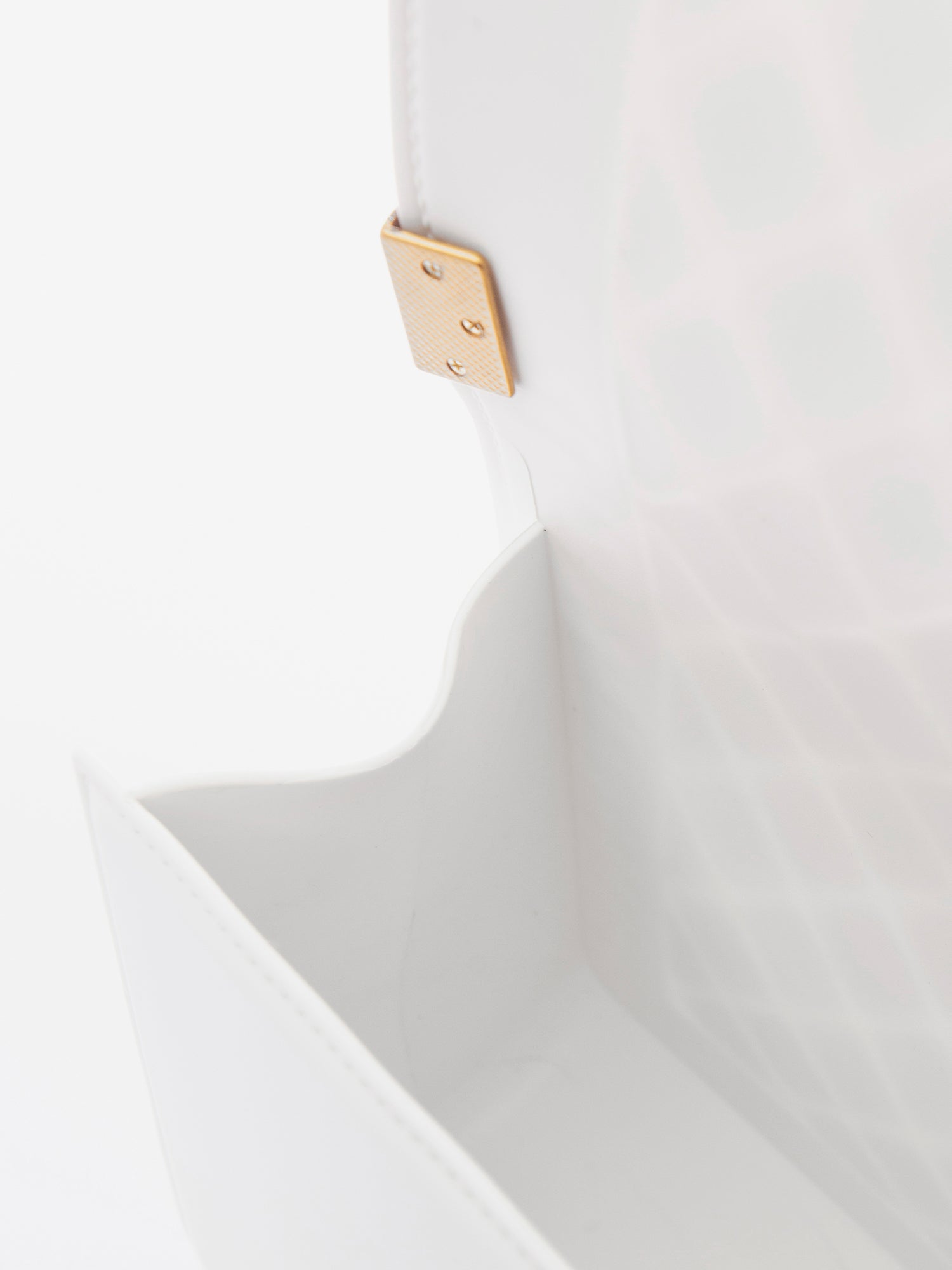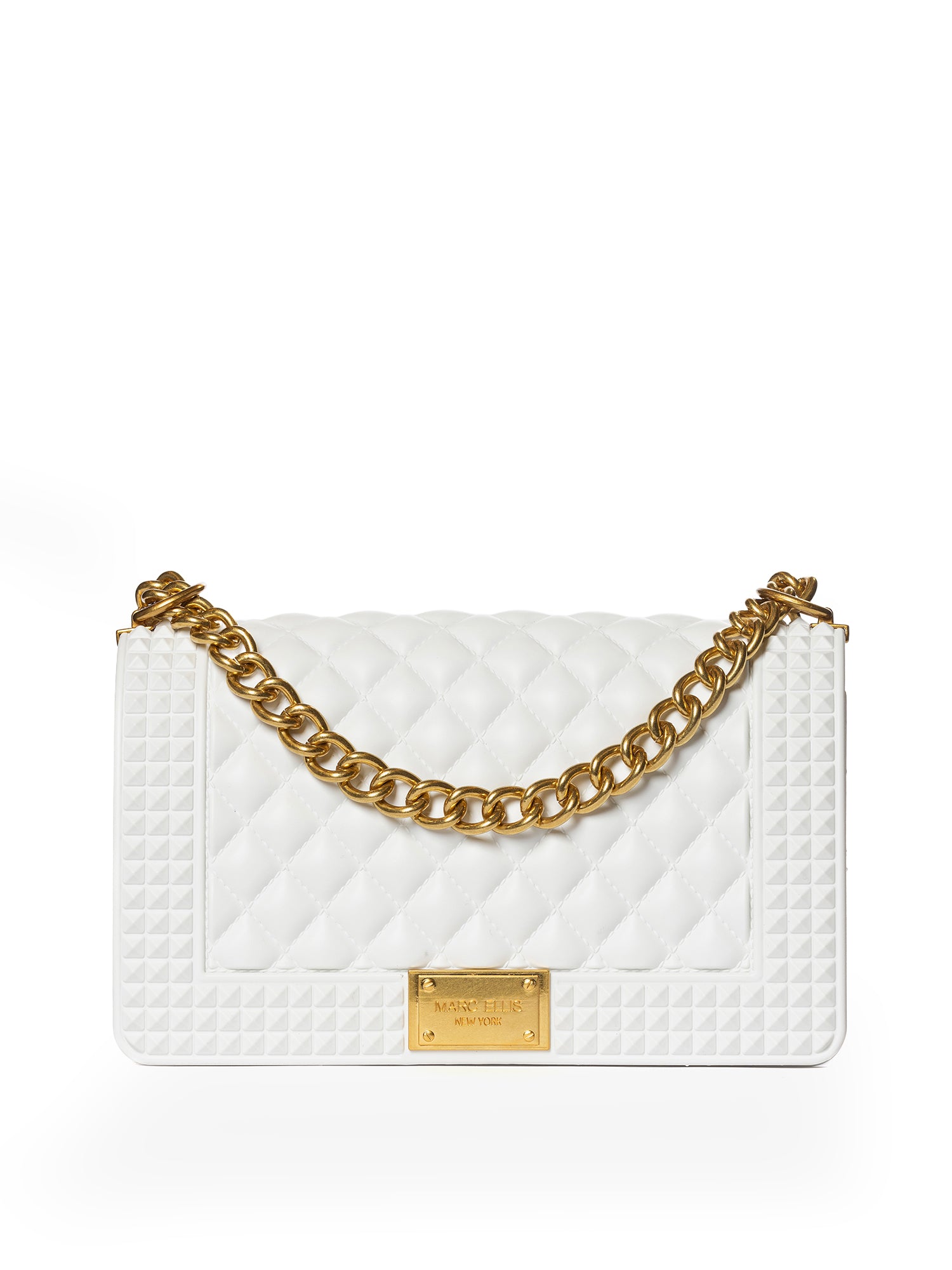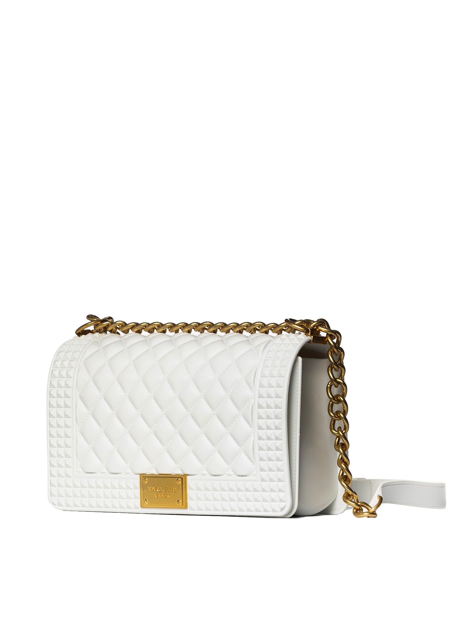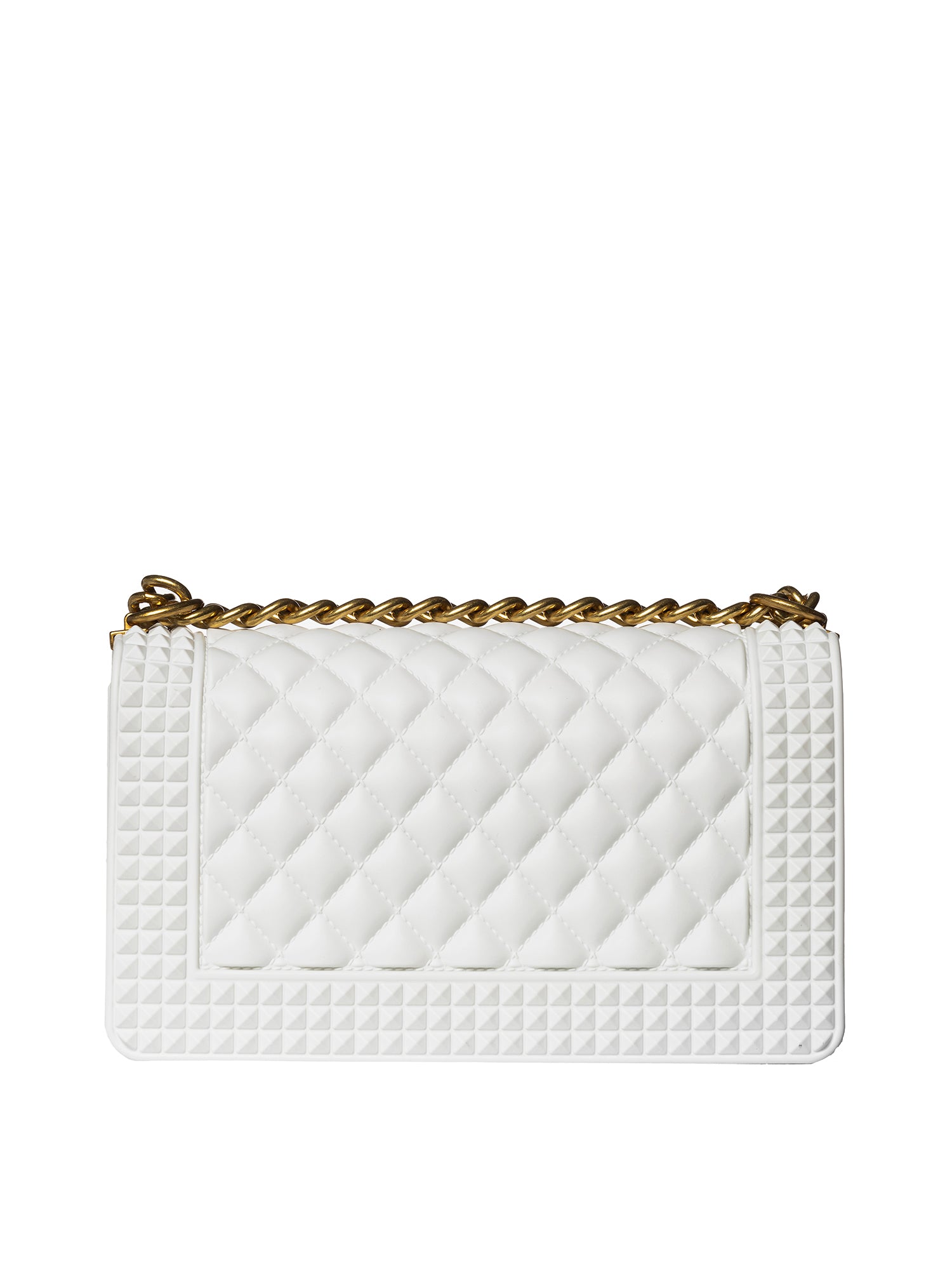 Realizzata interamente in gomma di alta qualità, questa borsa si distingue per la sua texture matelassé, un dettaglio iconico che aggiunge un tocco di lusso ad ogni outfit. La sua forma compatta e strutturata è valorizzata da una raffinata tracolla a catena, che consente di portarla comodamente a spalla o di trasformarla in una pochette elegante.