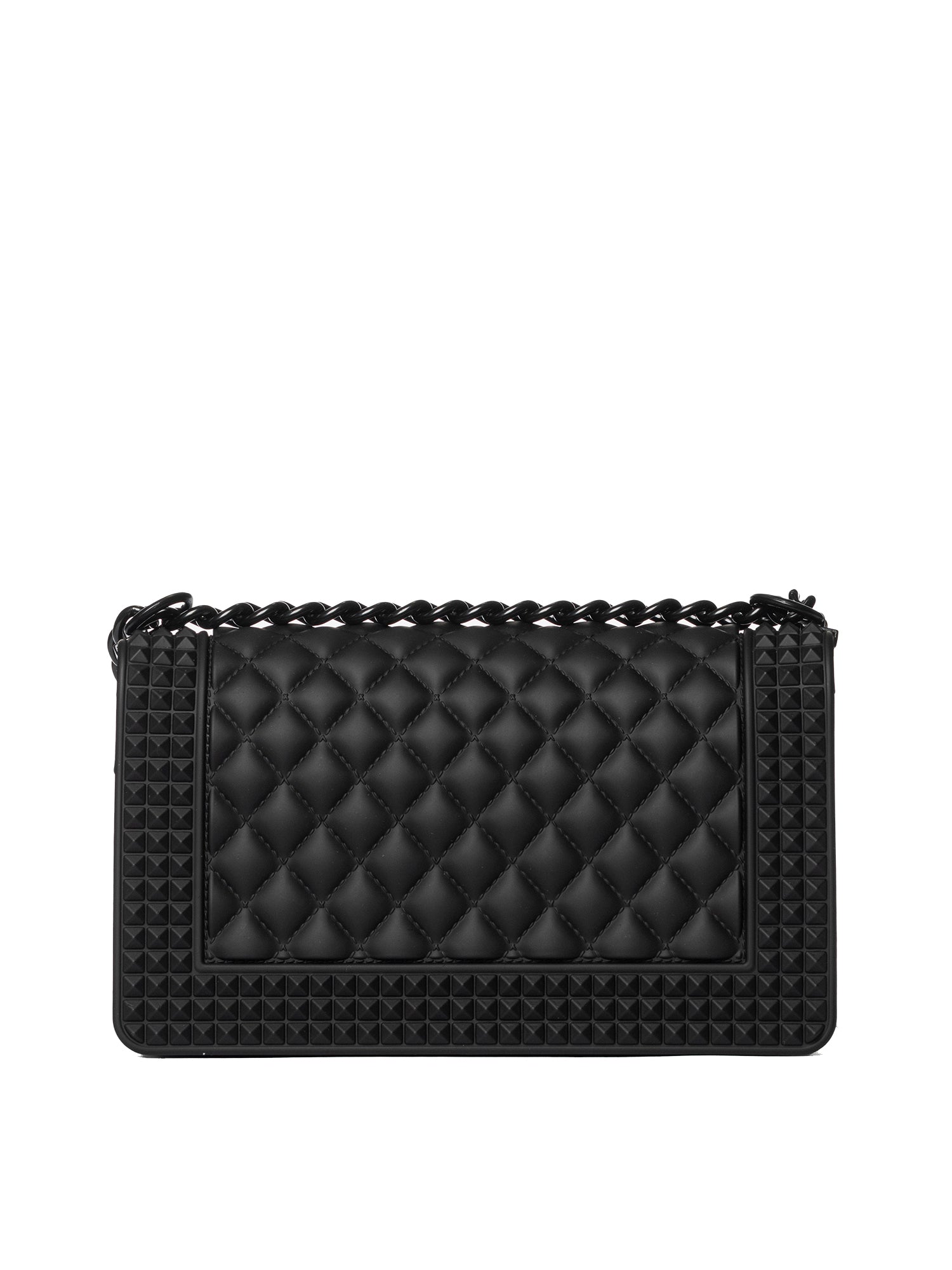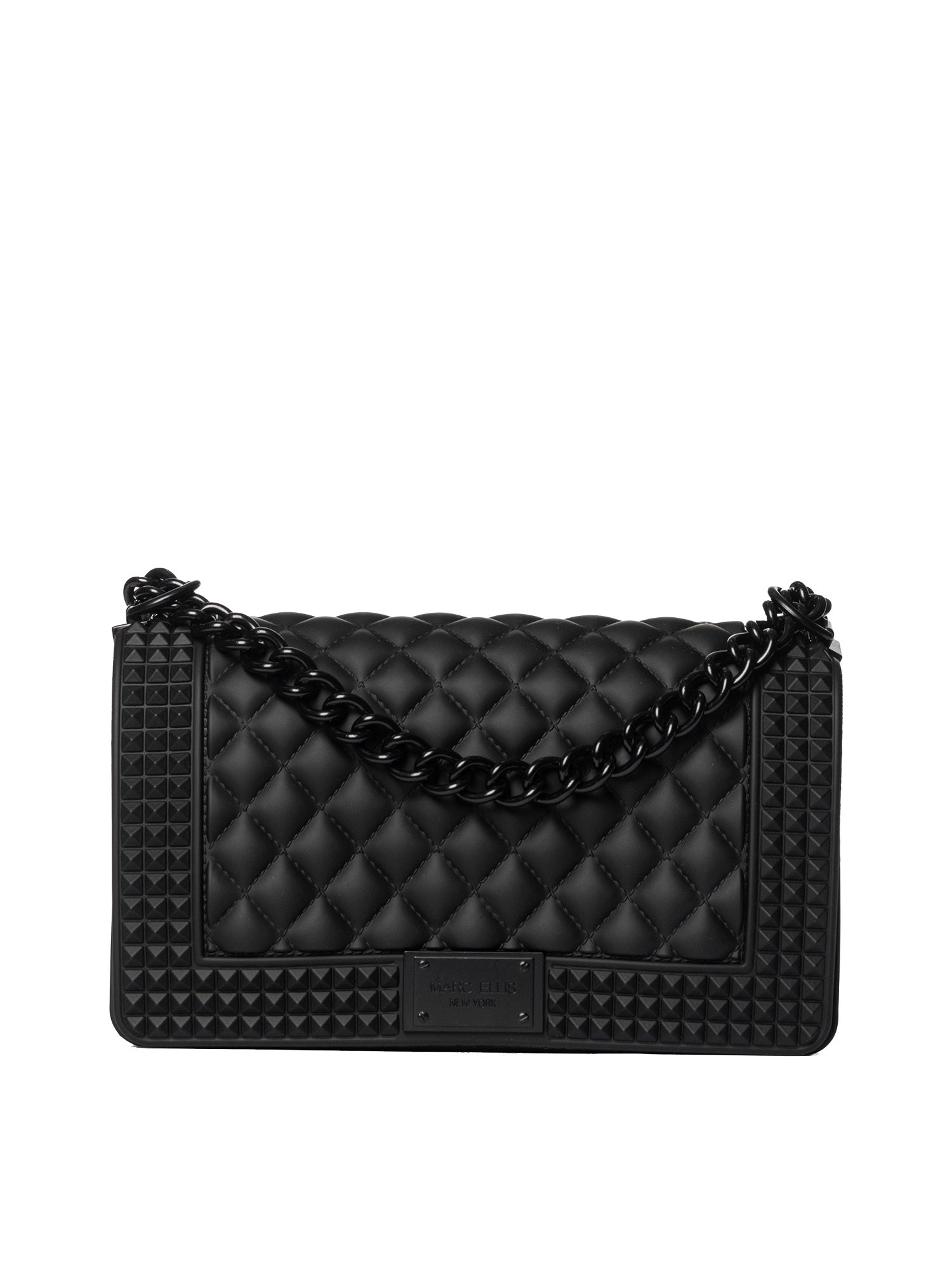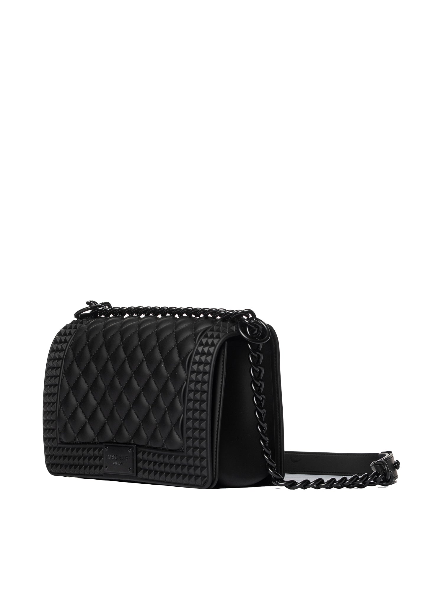 Realizzata interamente in gomma di alta qualità, questa borsa si distingue per la sua texture matelassé, un dettaglio iconico che aggiunge un tocco di lusso ad ogni outfit. La sua forma compatta e strutturata è valorizzata da una raffinata tracolla a catena, che consente di portarla comodamente a spalla o di trasformarla in una pochette elegante.