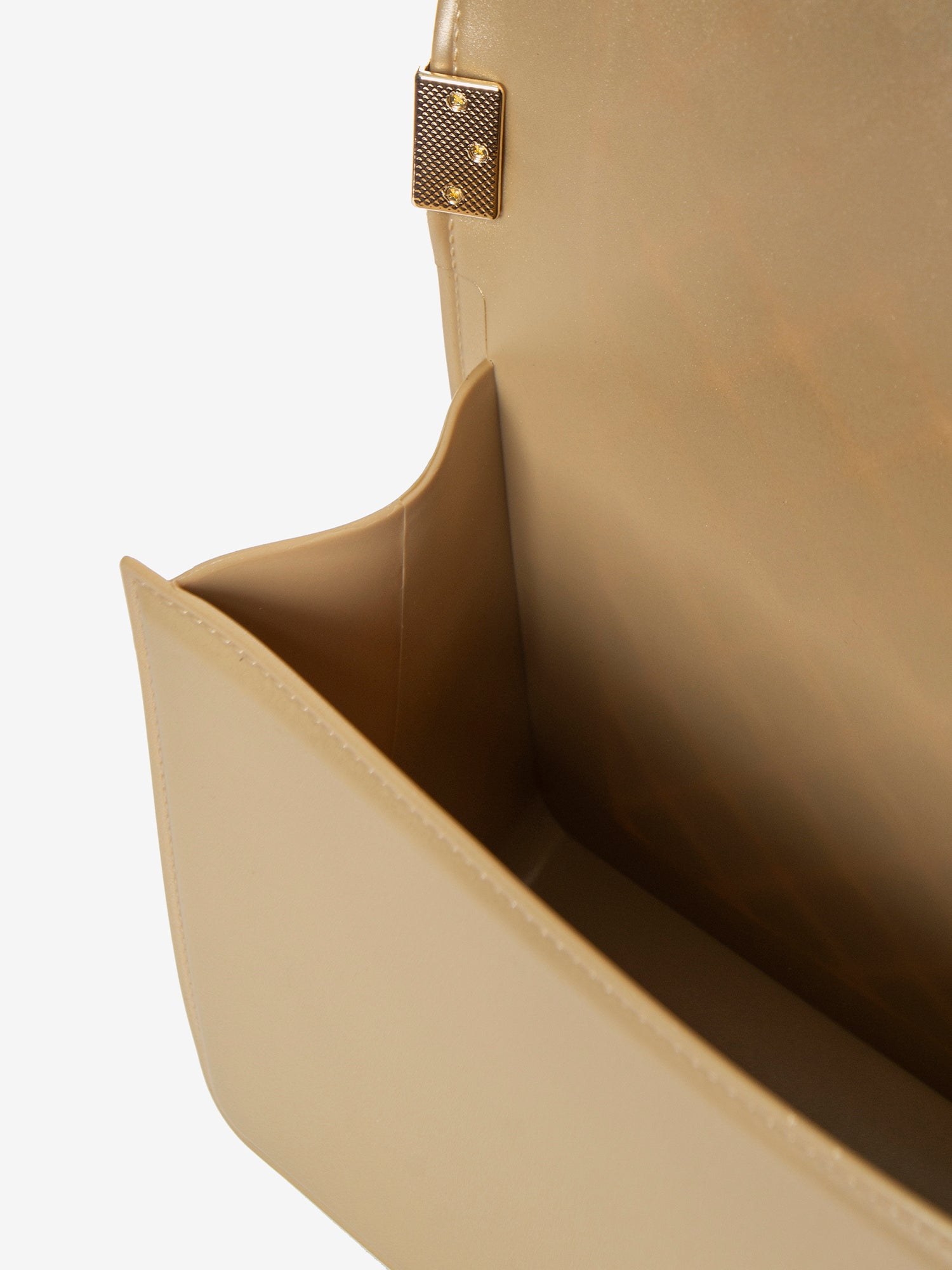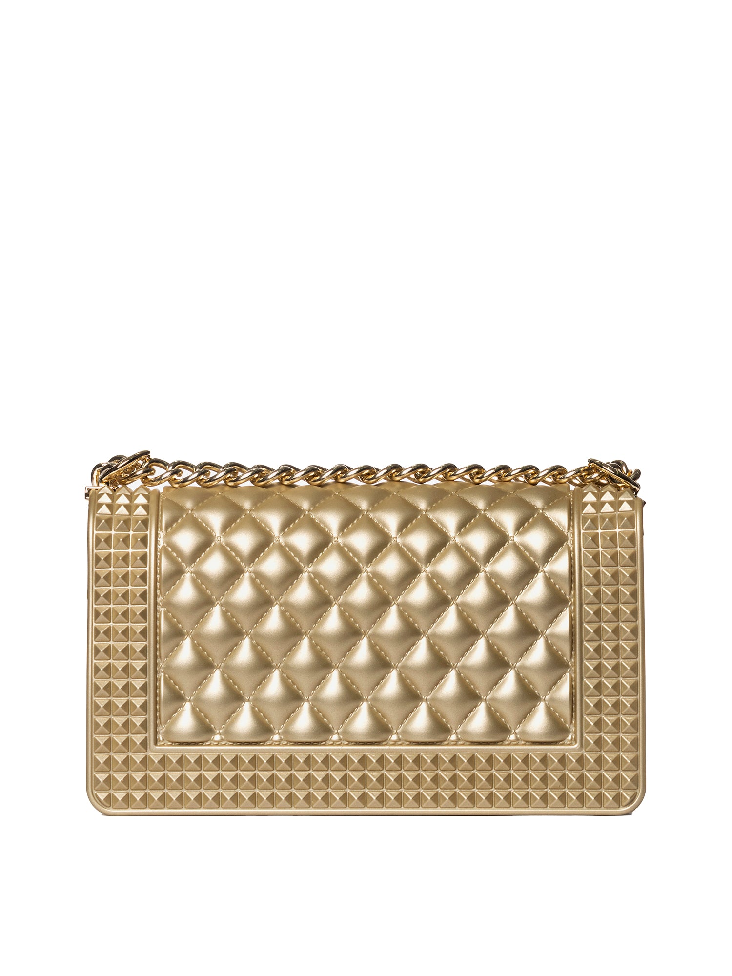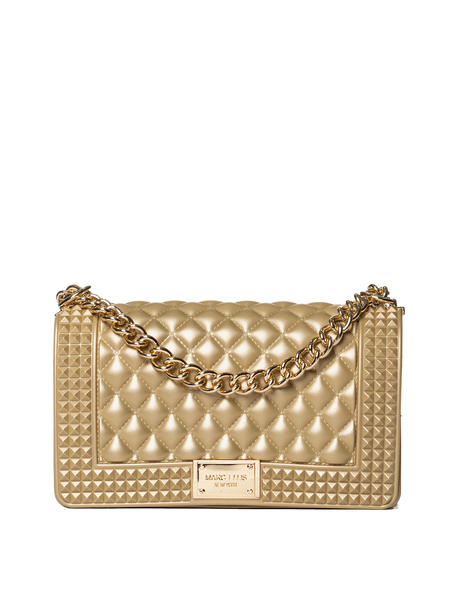 Realizzata interamente in gomma di alta qualità, questa borsa si distingue per la sua texture matelassé, un dettaglio iconico che aggiunge un tocco di lusso ad ogni outfit. La sua forma compatta e strutturata è valorizzata da una raffinata tracolla a catena, che consente di portarla comodamente a spalla o di trasformarla in una pochette elegante.