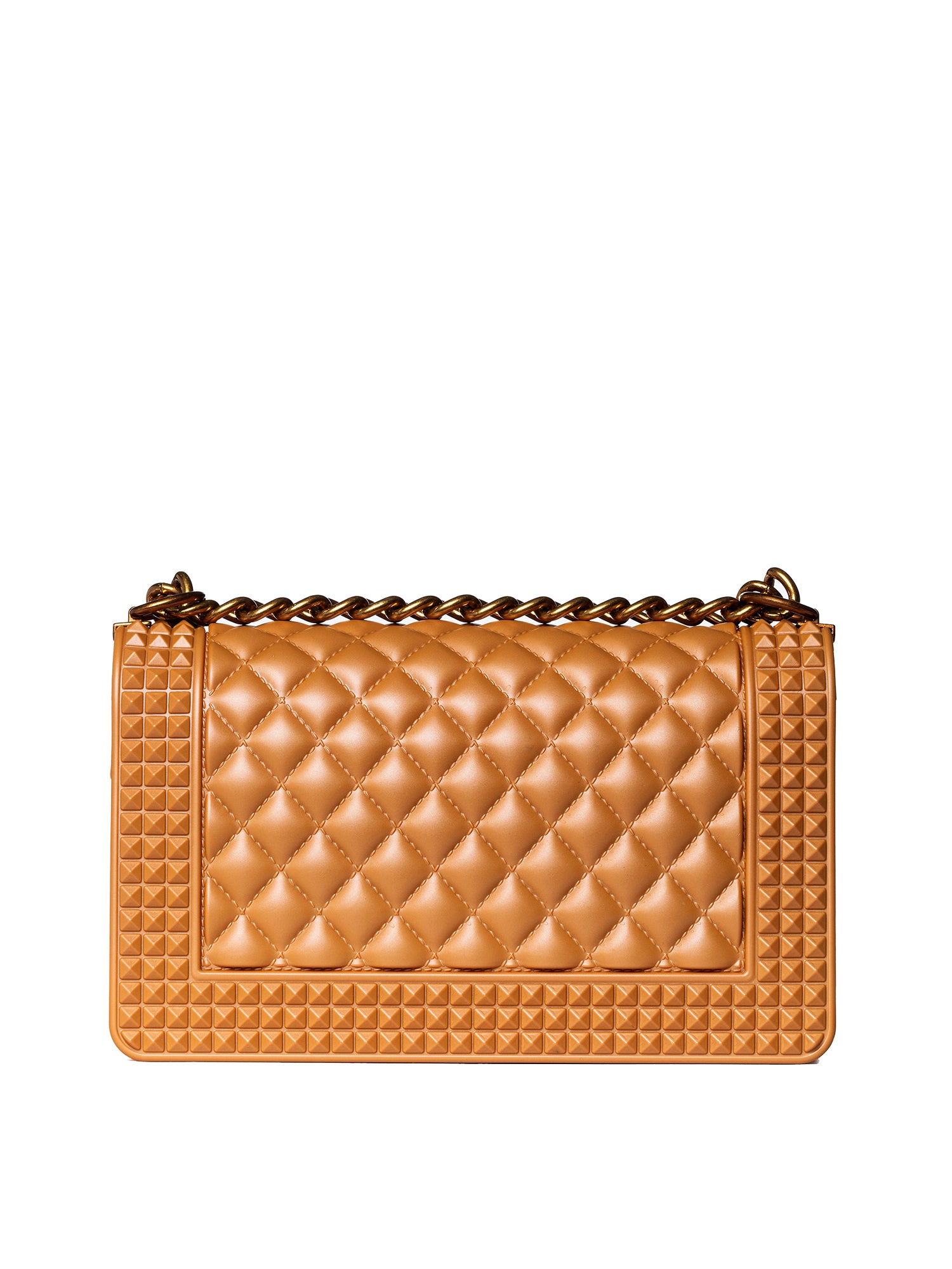Realizzata interamente in gomma di alta qualità, questa borsa si distingue per la sua texture matelassé, un dettaglio iconico che aggiunge un tocco di lusso ad ogni outfit. La sua forma compatta e strutturata è valorizzata da una raffinata tracolla a catena, che consente di portarla comodamente a spalla o di trasformarla in una pochette elegante.