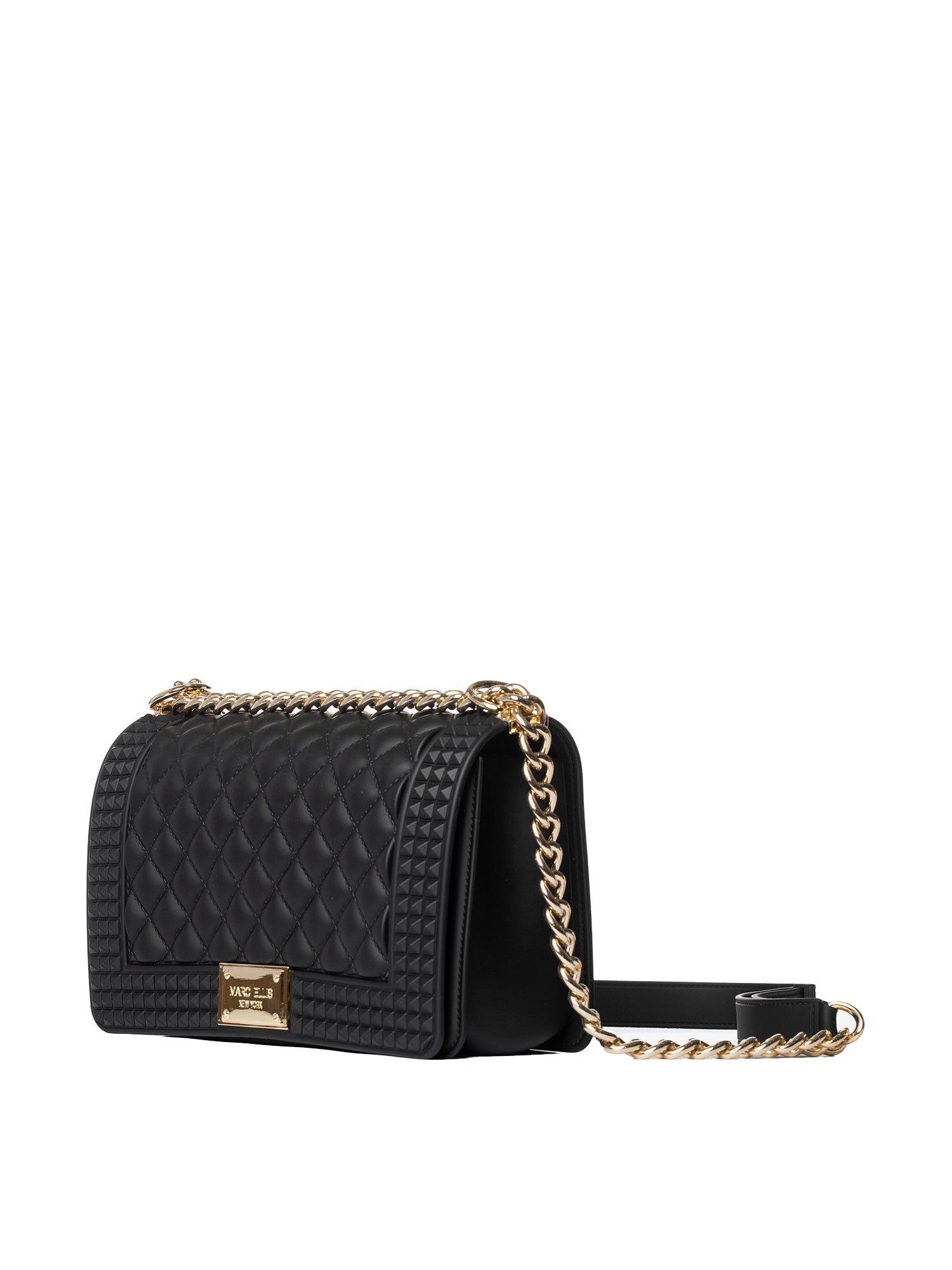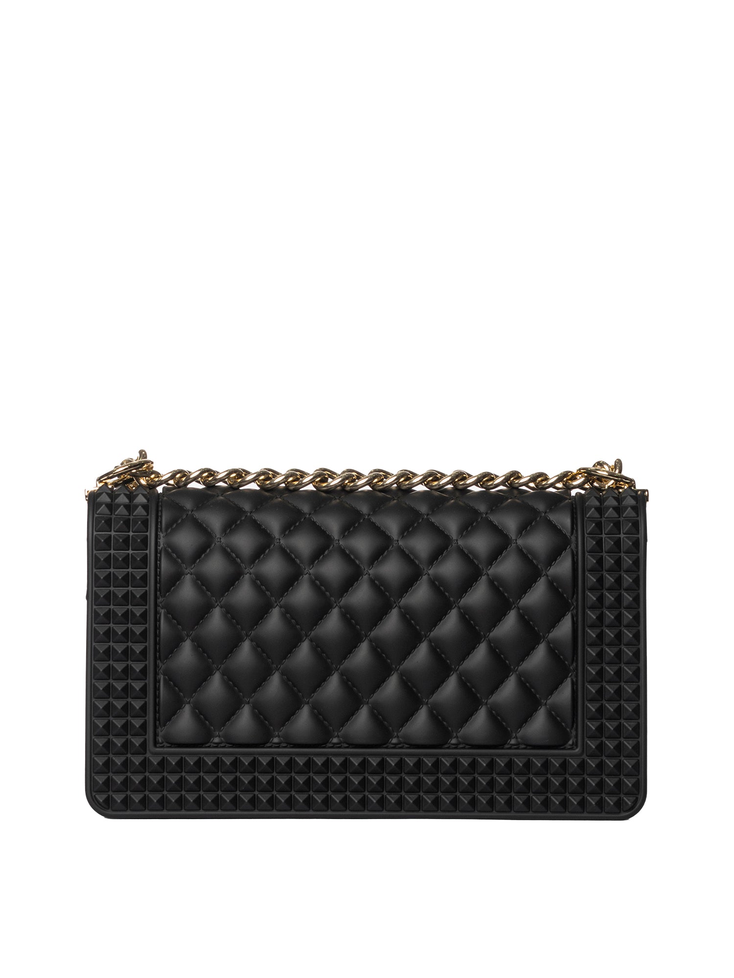 Realizzata interamente in gomma di alta qualità, questa borsa si distingue per la sua texture matelassé, un dettaglio iconico che aggiunge un tocco di lusso ad ogni outfit. La sua forma compatta e strutturata è valorizzata da una raffinata tracolla a catena, che consente di portarla comodamente a spalla o di trasformarla in una pochette elegante.