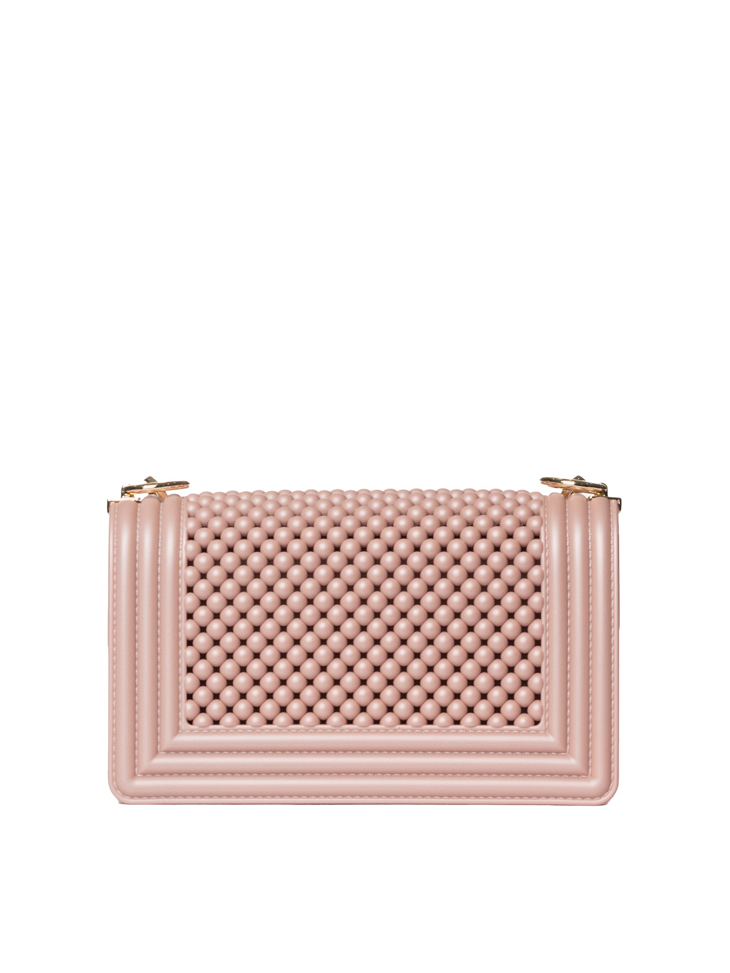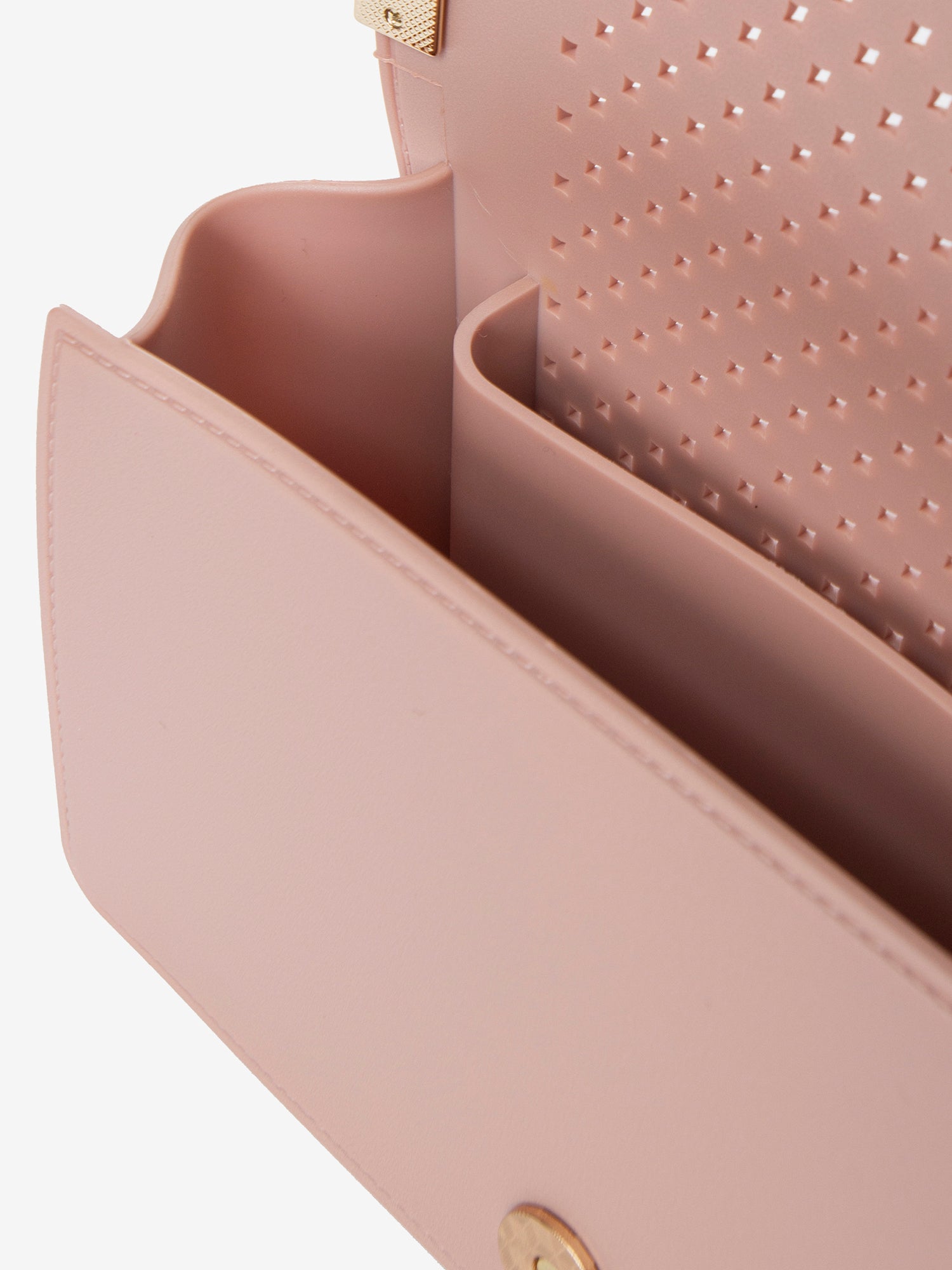 Realizzata interamente in gomma di alta qualità, questa borsa si distingue per la sua texture unica, ottenuta grazie alla lavorazione artigianale che crea un motivo traforato elegante e moderno. La gomma, utilizzata sia per l'esterno che per la fodera interna, conferisce alla borsa una resistenza e una flessibilità eccezionali, garantendo al contempo un tocco distintivo e inaspettato.