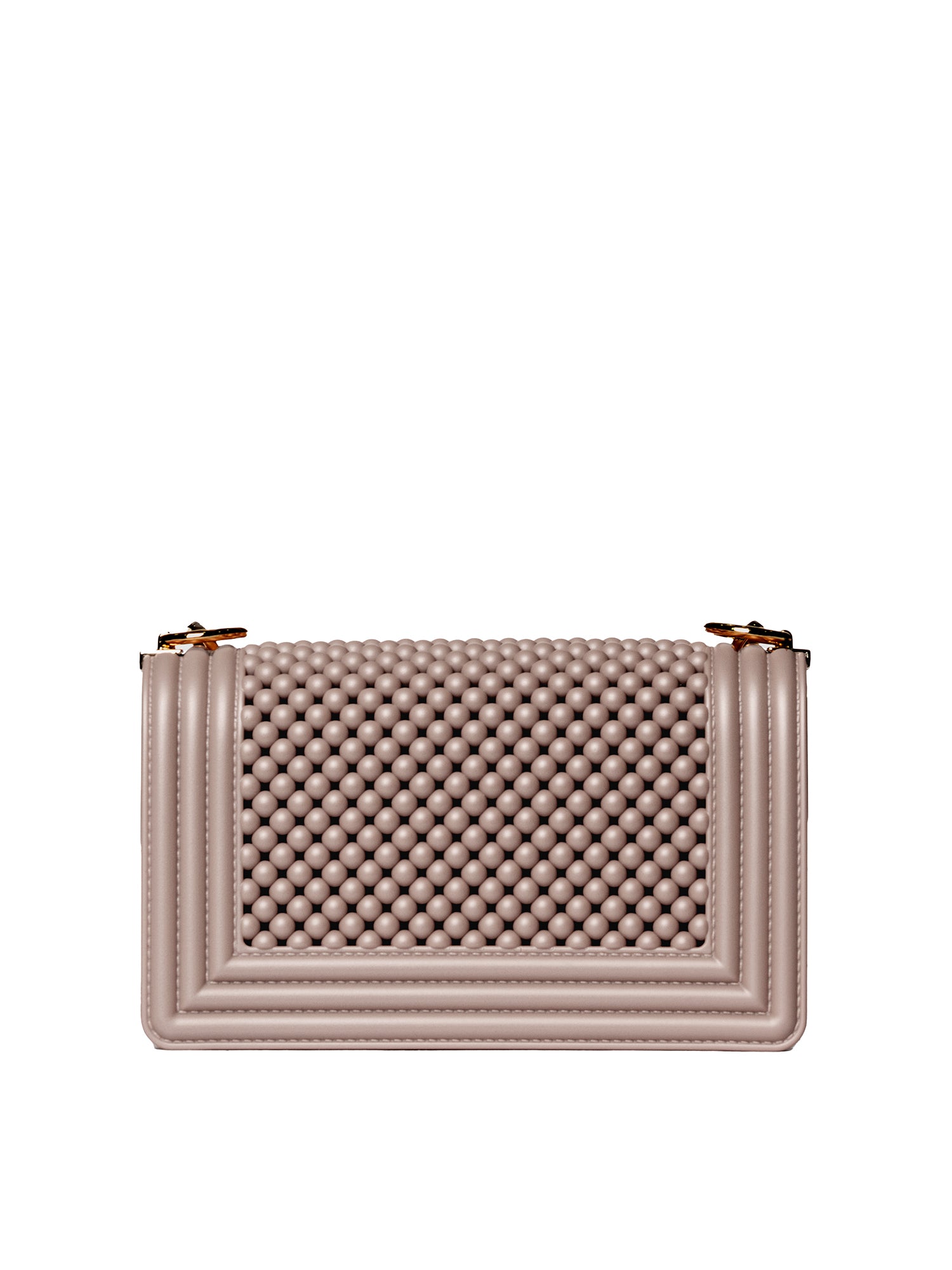 Realizzata interamente in gomma di alta qualità, questa borsa si distingue per la sua texture unica, ottenuta grazie alla lavorazione artigianale che crea un motivo traforato elegante e moderno. La gomma, utilizzata sia per l'esterno che per la fodera interna, conferisce alla borsa una resistenza e una flessibilità eccezionali, garantendo al contempo un tocco distintivo e inaspettato.
