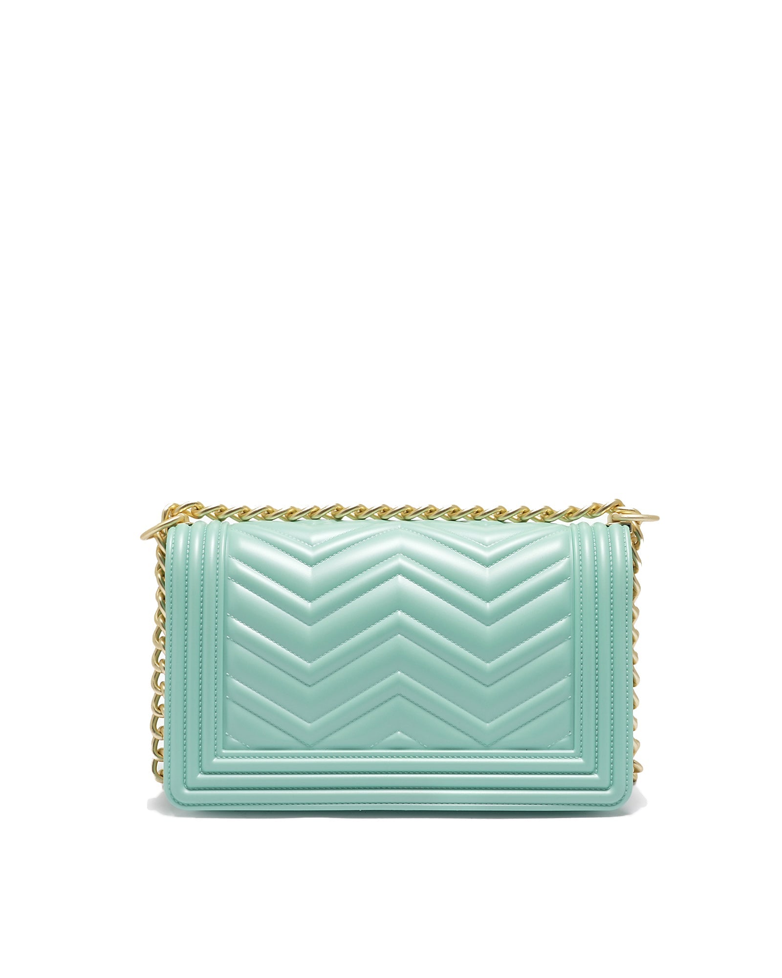 Borsa a mano da donna. La chiusura è con girello. Le tasche interne sono assenti. Le tasche esterne sono assenti. La tracolla è catena. Il manico è assente. Gli scomparti interni sono uno. Il materiale esterno è PVC.