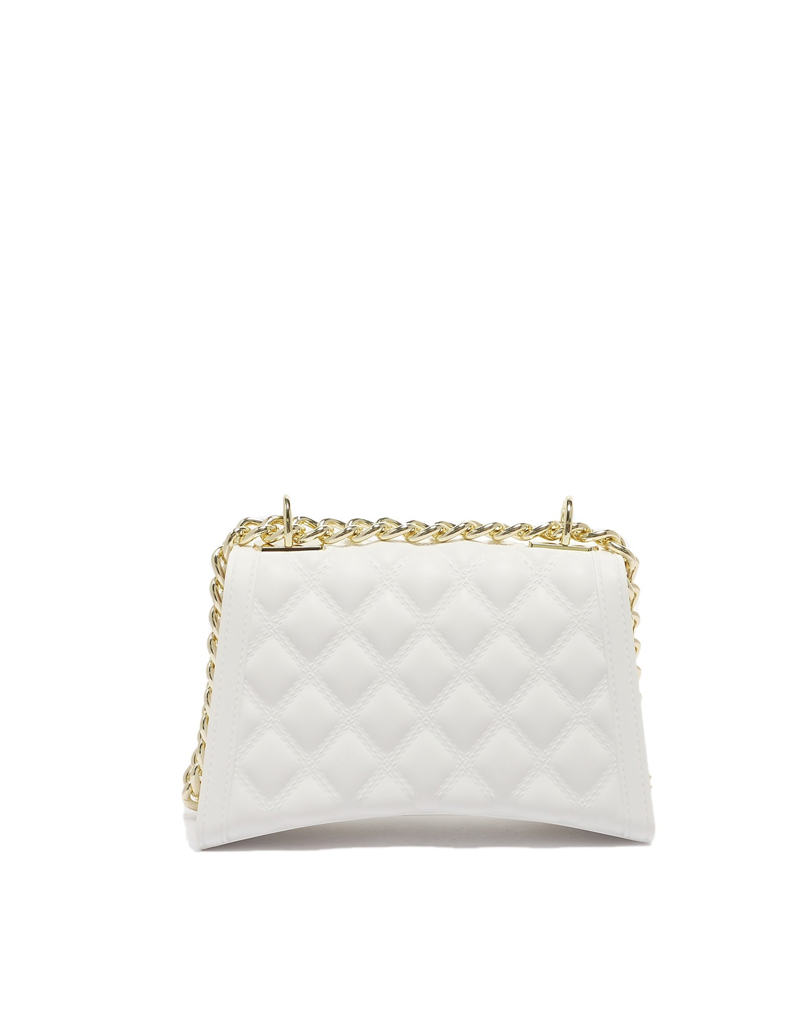 Borsa a mano da donna. La chiusura è ad incastro. Le tasche interne sono assenti. Le tasche esterne sono assenti. La tracolla è catena. Il manico è assente. Gli scomparti interni sono uno. Il materiale esterno è PVC.
