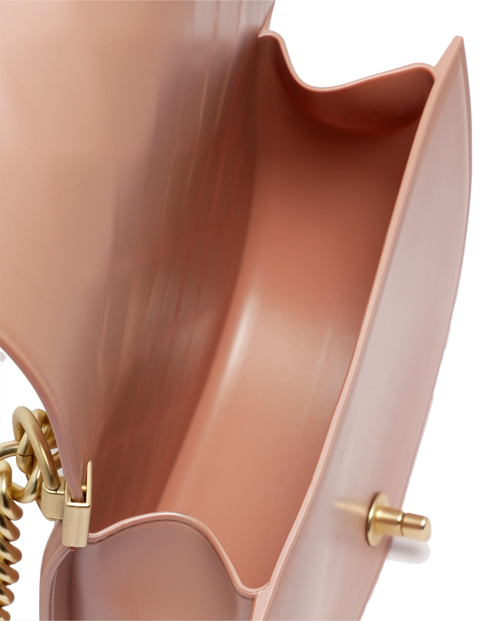 Borsa a mano da donna. La chiusura è con girello. Le tasche interne sono assenti. Le tasche esterne sono assenti. La tracolla è catena. Il manico è assente. Gli scomparti interni sono uno. Il materiale esterno è PVC.