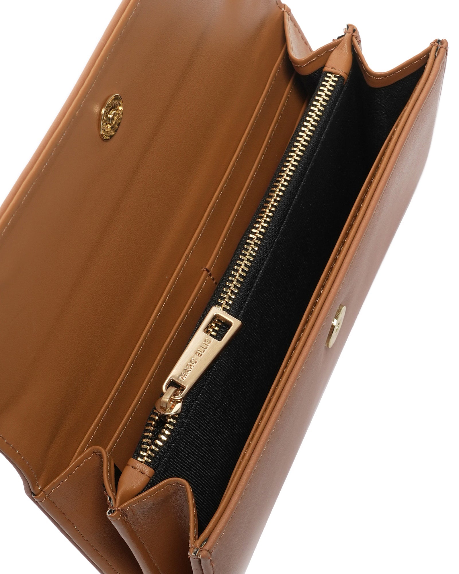 Portafoglio da donna. La chiusura è con bottone magnetico. Le tasche interne sono una zip e portacarte. Le tasche esterne sono assenti. La tracolla è assente. Il manico è assente. Gli scomparti interni sono due.