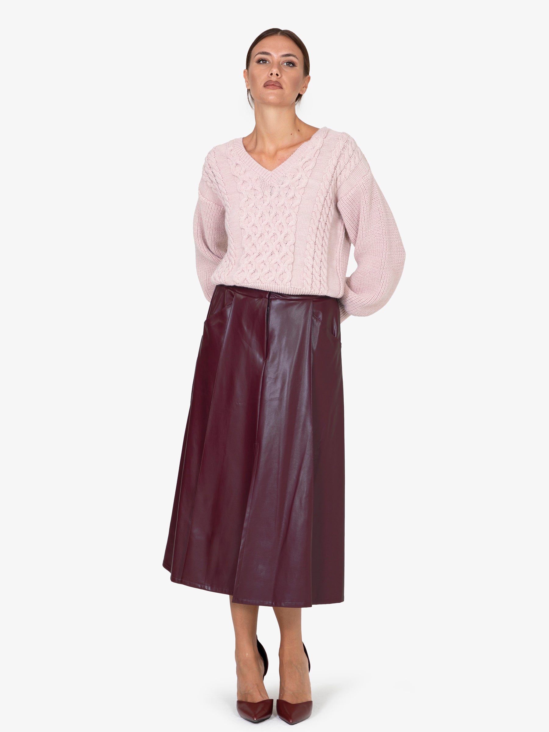 Eleganza senza tempo e ricercatezza nei dettagli definiscono questa gonna, un capo versatile capace di trasformare ogni outfit. Realizzata con un sofisticato mix di poliuretano e poliestere, la sua texture liscia e avvolgente offre un comfort ineguagliabile e una silhouette impeccabile.