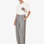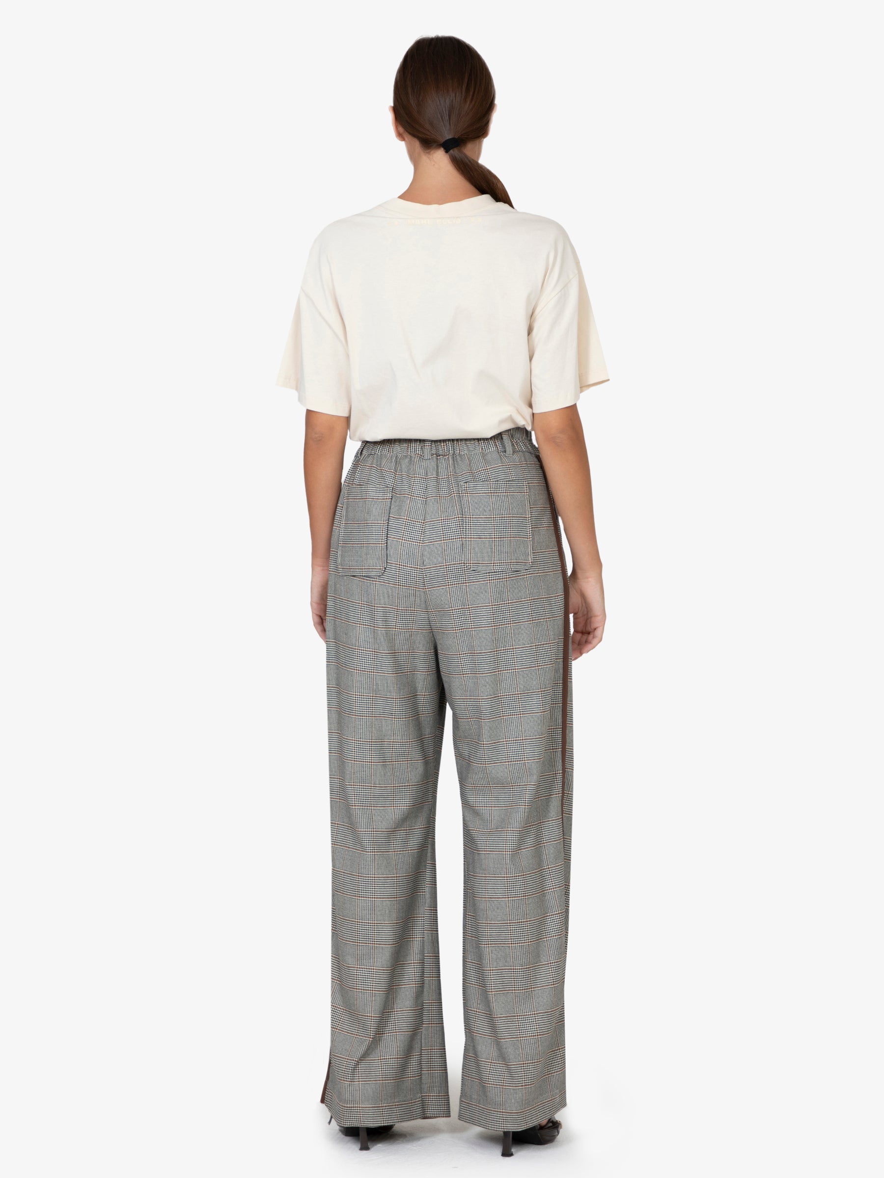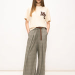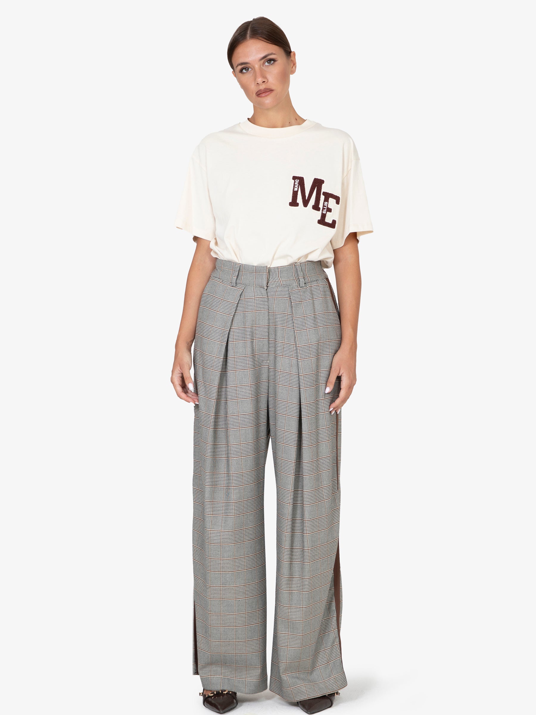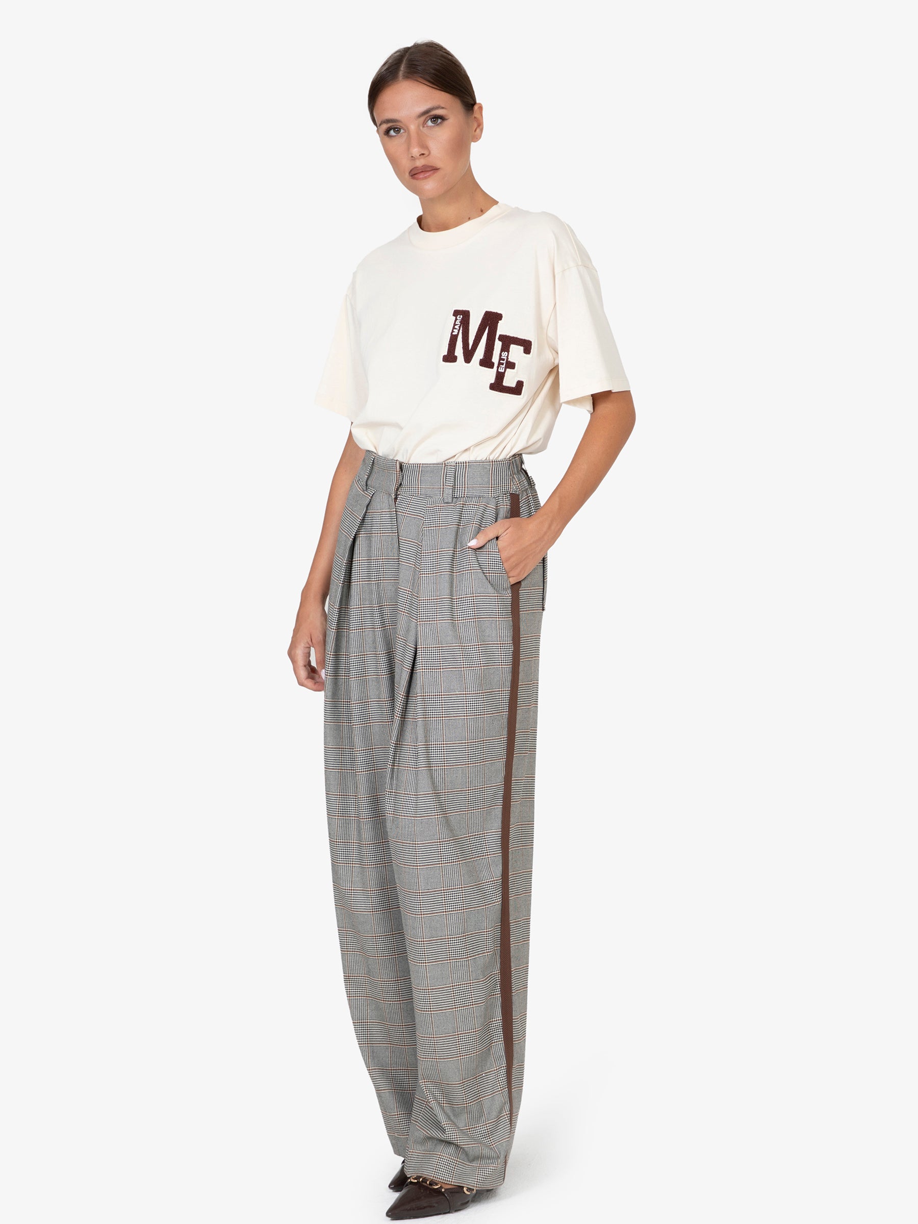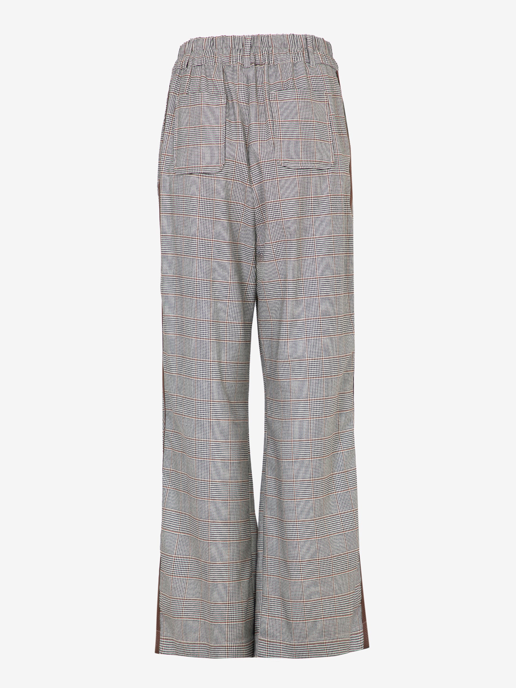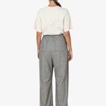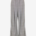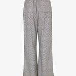 Il taglio ampio e la vita alta esaltano la figura, mentre la texture a quadri aggiunge un tocco di originalità e ricercatezza. L'assenza di chiusure enfatizza la semplicità del design, rendendoli facili da indossare e perfetti per ogni occasione casual.
