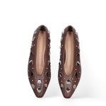 Il dettaglio distintivo risiede nell'originale lavorazione con tagli laser che creano un motivo geometrico e sensuale sulla tomaia, donando un look contemporaneo e sofisticato. La forma a punta affusolata allunga la silhouette, mentre il tacco moderato offre comfort e stabilità senza rinunciare all'eleganza.