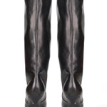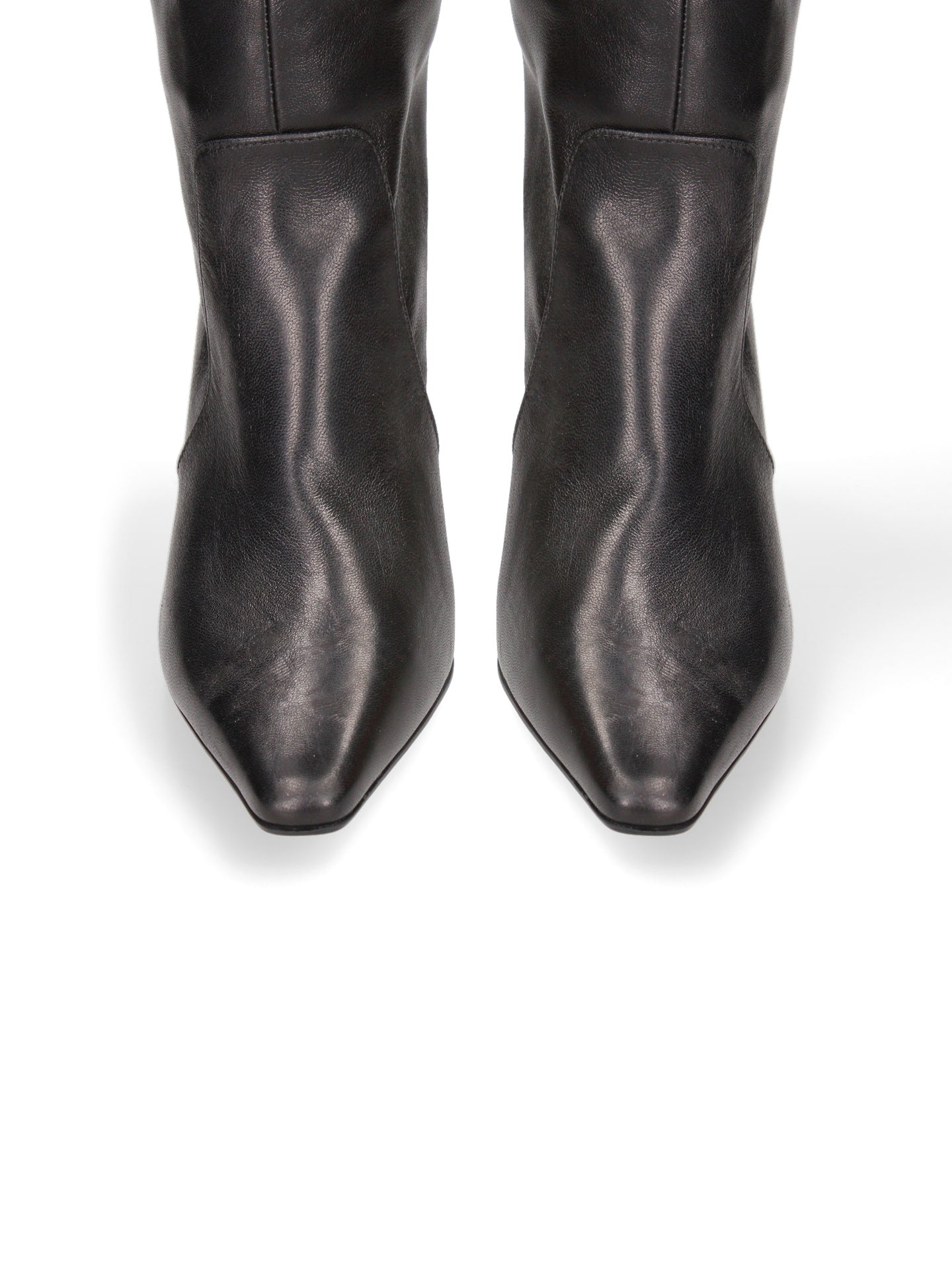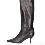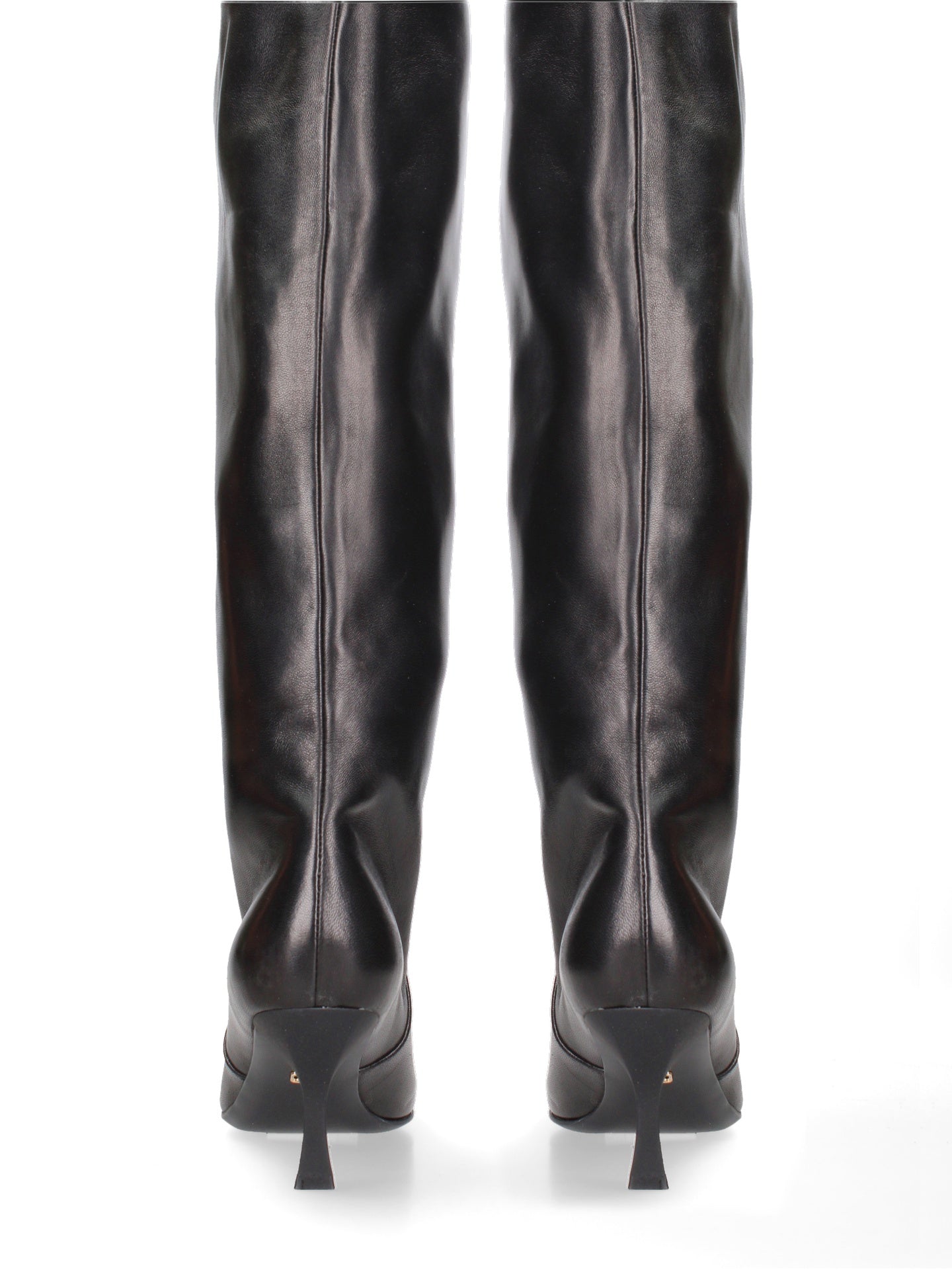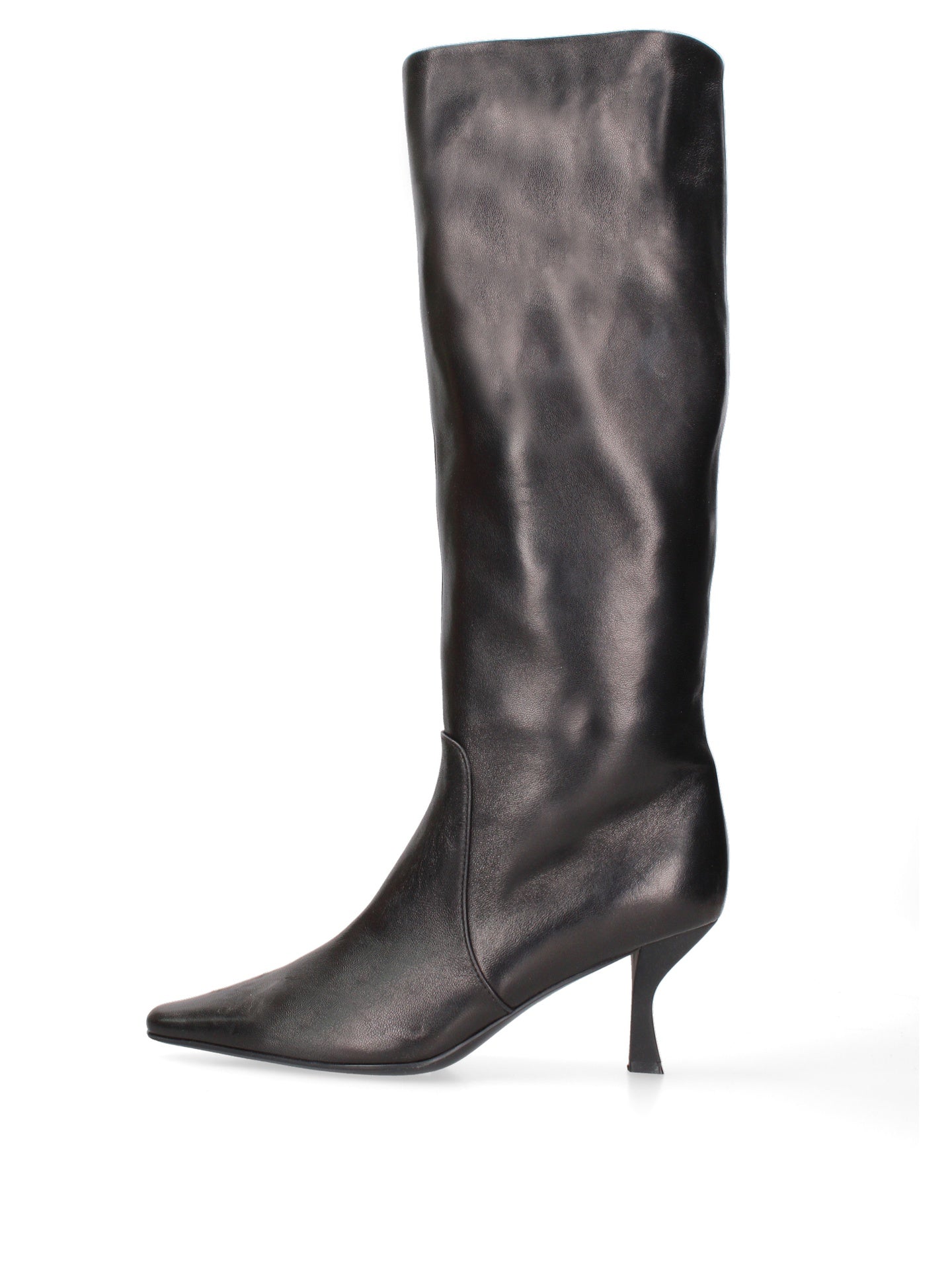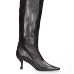 Eleva il tuo stile con questi stivali alti dal design sofisticato e senza tempo. Realizzati in pregiata vera pelle, questi stivali incarnano l'eleganza artigianale e la qualità superiore. La silhouette slanciata e la punta affusolata donano un tocco di raffinatezza ad ogni outfit, mentre l'assenza di chiusura ne facilita la calzata e sottolinea la linea pulita.
